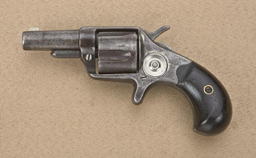 Colt New Line .41 cal., revolver, 2-1/4” barrel, nickel finish, wood grips, #6679. This gun is in overall fair + to good condition showing traces of nickel finish in protected areas and on the frame’s circularsideplate with balance gone to a dark brown patina over some scattered pin prick pitting, good action, dark bore, overall good grips with some wear and some scattered old mars; desirable in the .41 caliber (this iscenterfire and so marked on the frame by the factory “C”) with only approx. 7,000 made in this large caliber. Est.: $175-$350.
