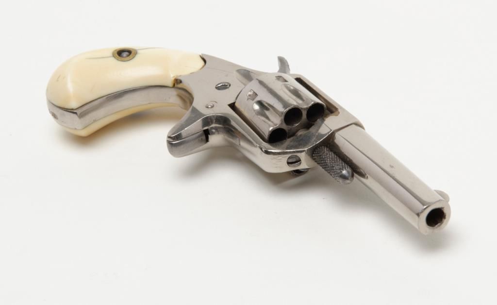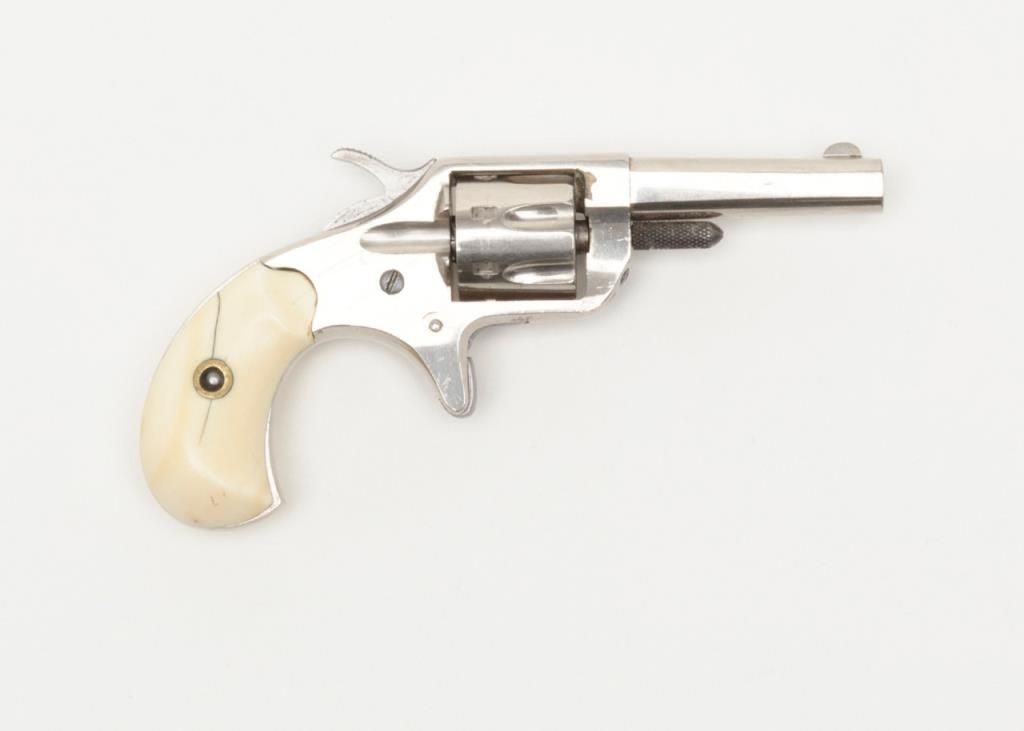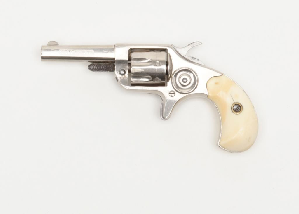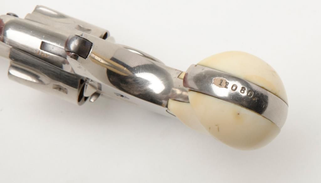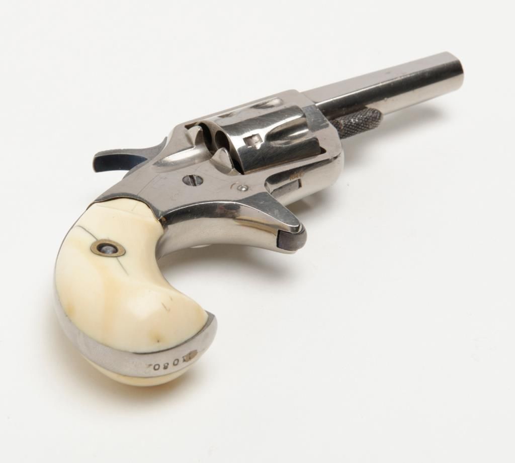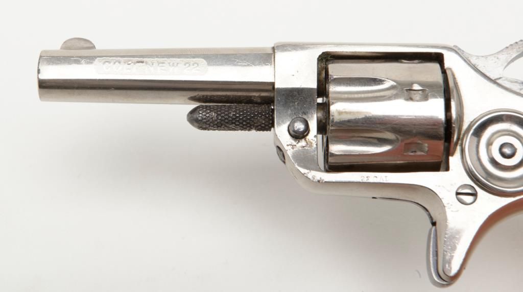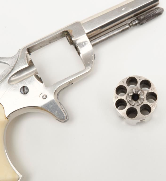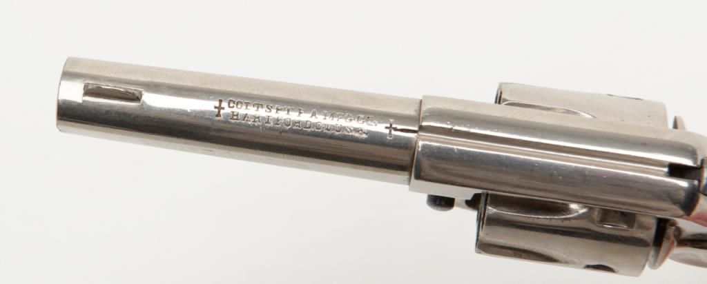 Colt New Line spur trigger revolver, .22 cal., 2-1/2” barrel, nickel finish with etched panel on barrel, period ivory grips, #11080 in “minty” condition showing the majority of its original finish, crisp etched panel, action and markings,fine bore and grips; a beautiful little New Line. (Antique). Est.: $500-$1,000