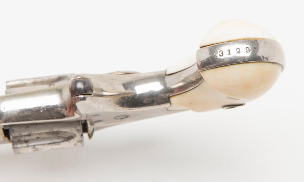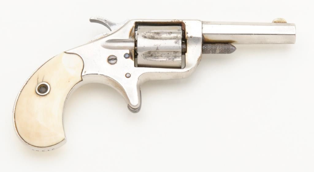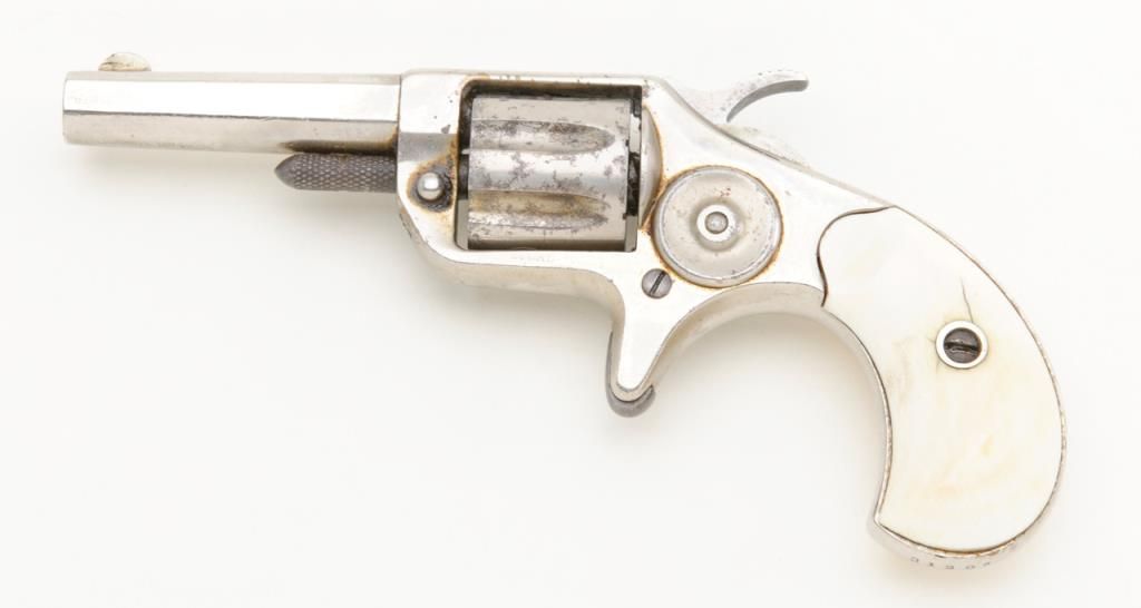 Colt New Line spur trigger revolver, .22 cal., 2-1/4” round barrel, nickel finish, ivory grips, #31226 in overall very good condition showing considerable finish with some scattered spots of erosion confined primarily to the cylinder andfiring areas, crisp action and markings, good bore and beautiful ivory grips. (Antique). Est.: $375-$750