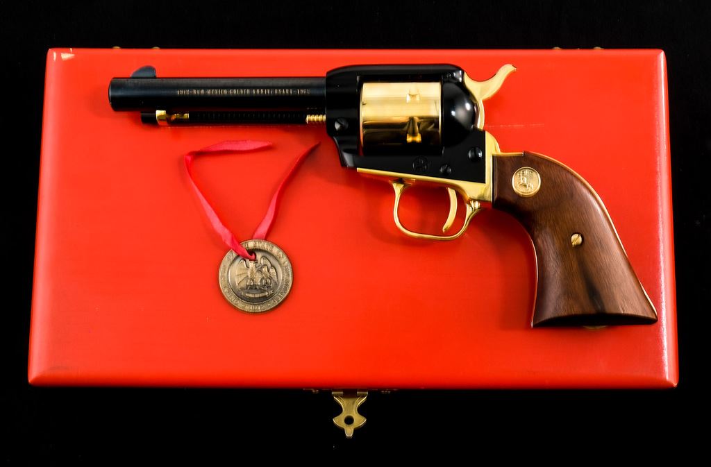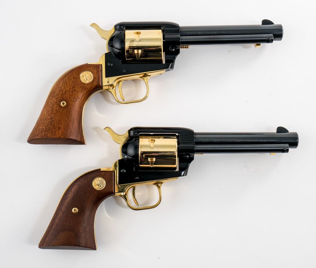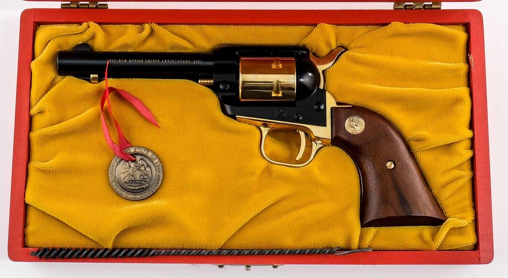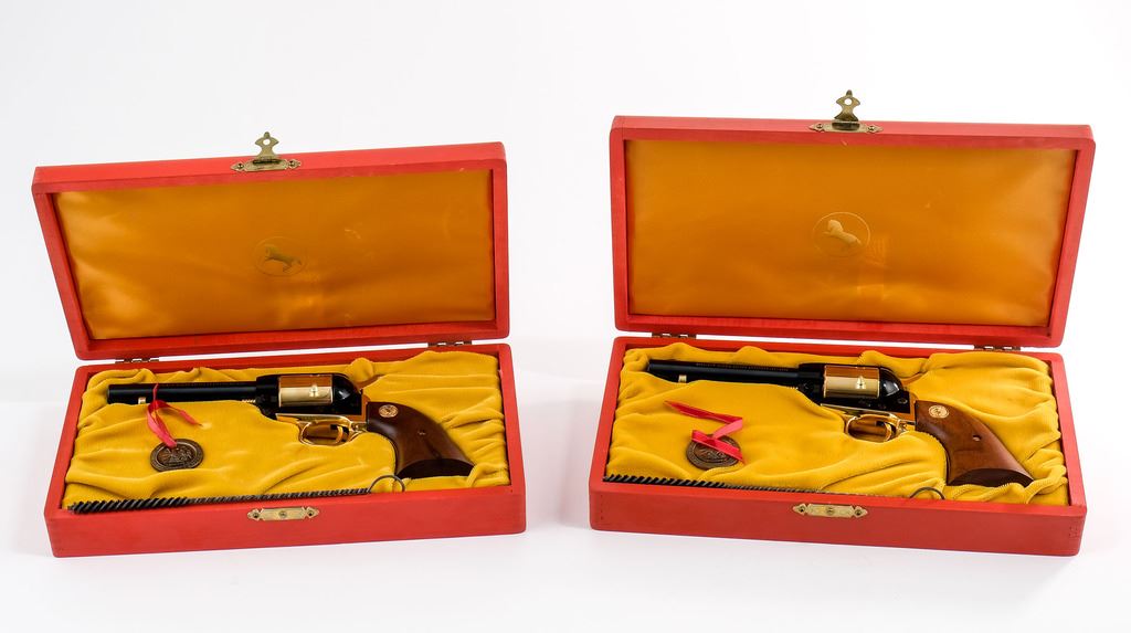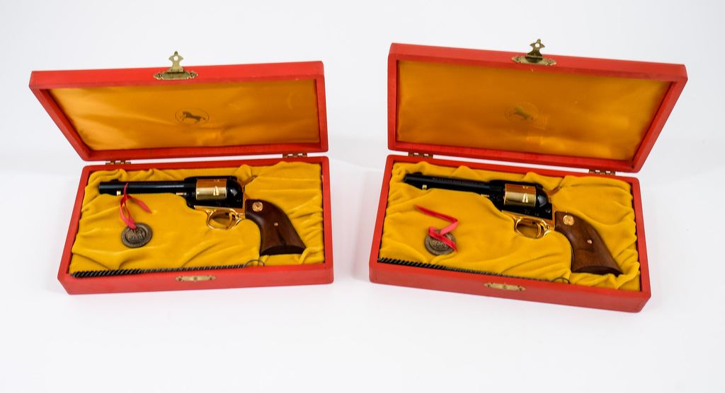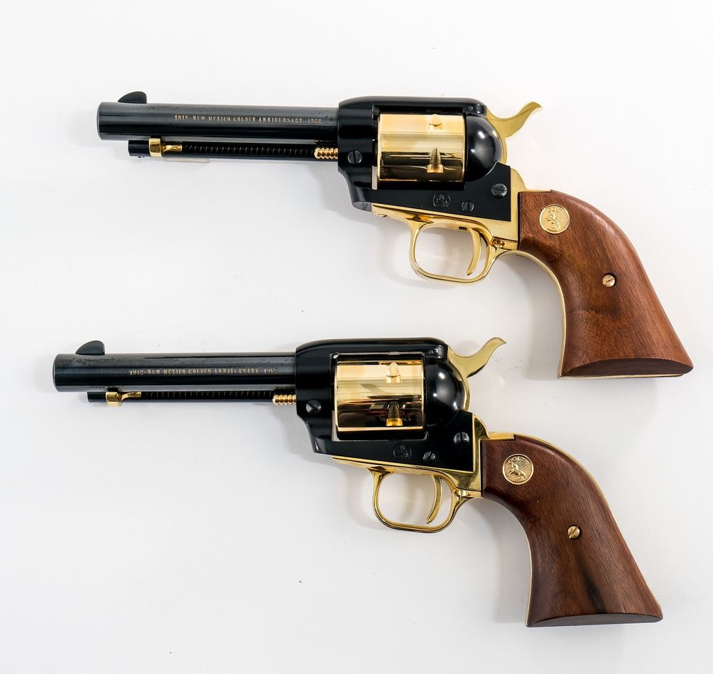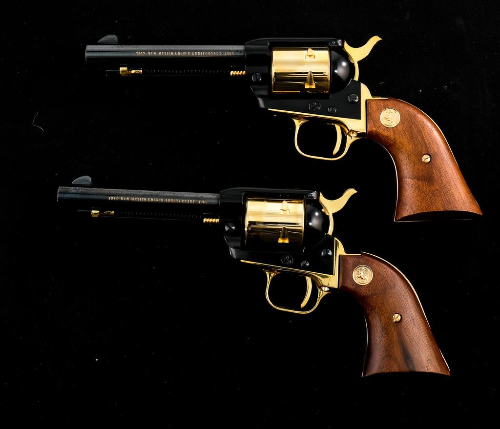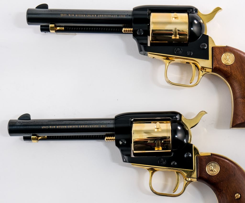 Made by Colt in 1962 in limited quantities to celebrate the 50th anniversary of New Mexico being admitted as the 47th State of the United States Based on a Colt Frontier Scout revolver. This sequential pair are laid in Colt presentation boxes finished in a unique orange-red color., lined with yellow satin material. 4.75" barrels are richly blued with gold ejector, cylinder, grip frame, and trigger. Admitted in 1912, New Mexico was one of the last States to officially be admitted. Only a 1000 made.*C&R Eligible Condition: 99%, guns have only the faints handling marks. Gold areas have some dried polish, seems to come off with only a little effort. Interior of boxes are excellent. Exterior of boxes show storage wear, one has scratch/split