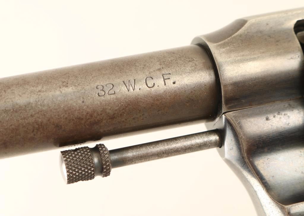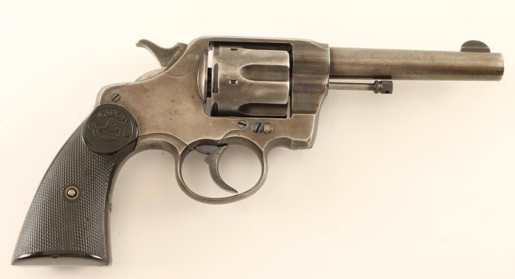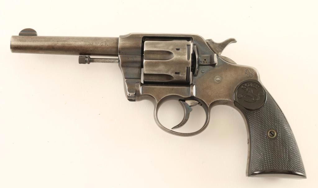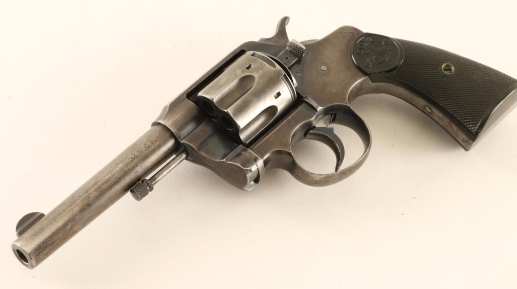 Antique medium frame double-action revolver chambered in .32-20 Winchester Center Fire, circa 1892. Features a blued finish with fire blued small parts, 4 1/2" barrel, round blade front sight, 'u' notched rear sight, non-shrouded ejector rod, fluted six-shot cylinder, smooth trigger, checkered hammer spur and two-piece checkered black plastic grips with "COLT" & Rampant Colt motif. Revolver exhibits approximately 10% of it's original blued finish showing heavy wear with the majority of the metal surfaces turned to a medium grey patina. Action is smooth with some play in the lock-up, bore good with some light scattered pitting, markings are good and plastic grips are very good with semi-worn points, small blemishes & a hairline crack on the top of the left panel. Condition is very good. ***Antique Firearm***