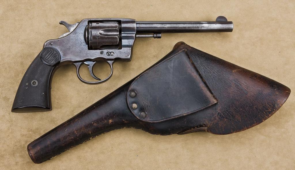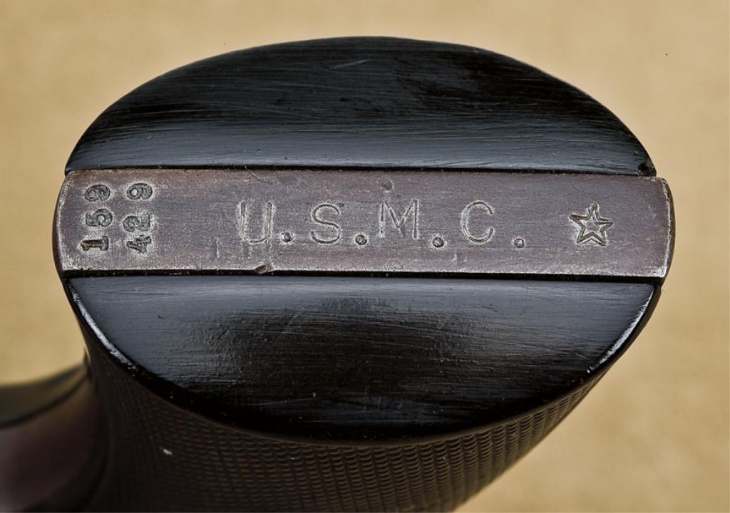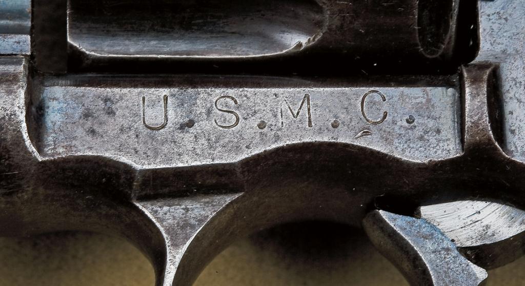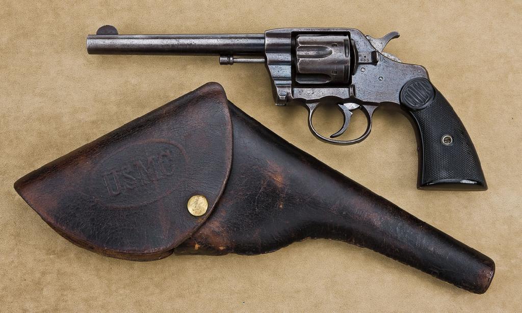 Colt New Navy Model DA revolver, USMC marked on the left side of the frame and on the butt strap, .38 cal., 6” barrel, blue finish, checkered Colt black hard rubber grips, #159429. This gun is in overall good condition with traces of original blue in protected areas with the balance gone to a brown plum patina, good bore, action is good, markings are good and the grips are very good overall. Factory letter confirms features except type of stocks “Not listed”; shipped to the US Government, Assistant Quartermaster, US Marine Corps on July 12, 1901 in a lot of 50. Also accompanied by a USMC-marked leather flap military holster in overall very good condition. Est.: $1,500-$3,000.