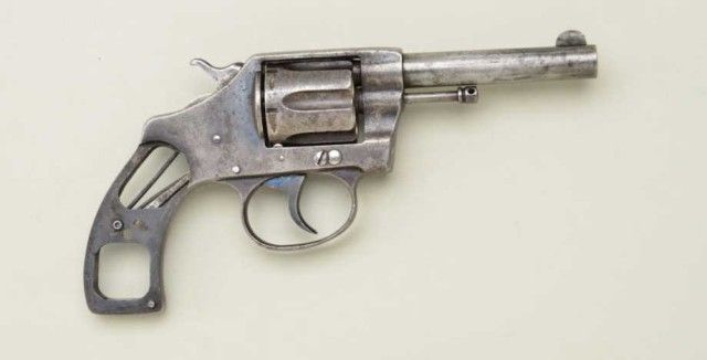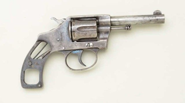 Colt New Pocket DA revolver, .32 cal., 3-1/2” barrel, blue finish, missing grips, #239. This older modern parts gun shows traces of blue on frame and trigger, action partially working; needs a gunsmith’s touch and a pairof grips or can be parted out for the gunsmith’s work bench (Dangerous Dave, here’s one for you). Est.: $50-$75.