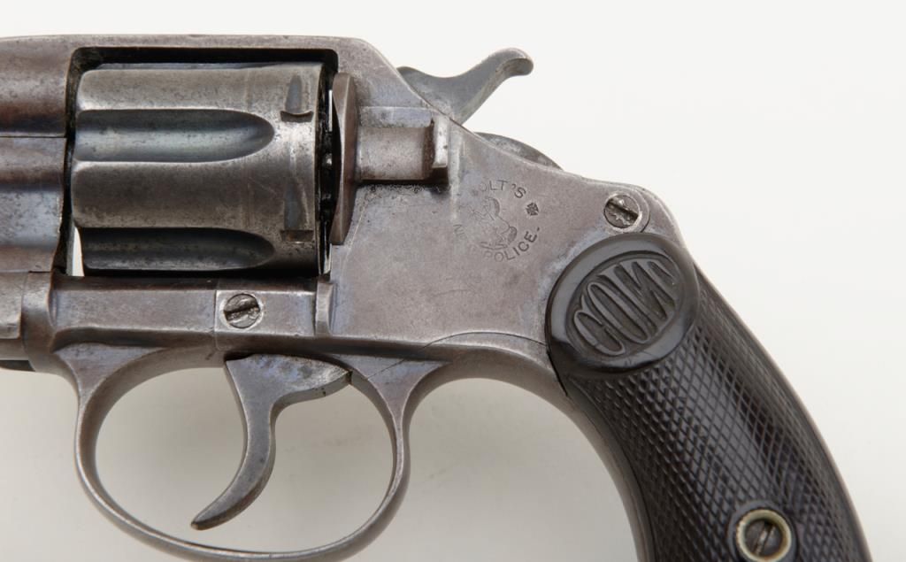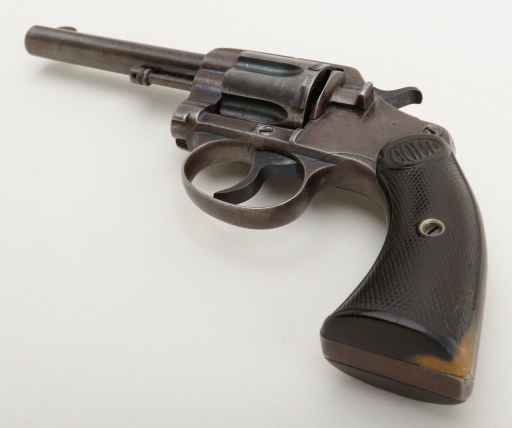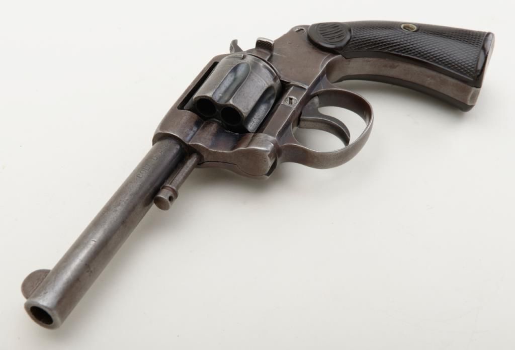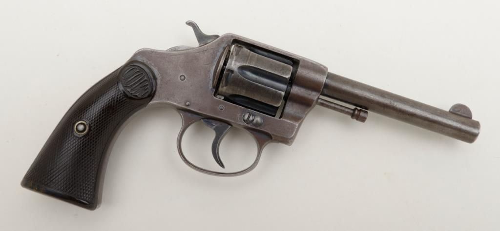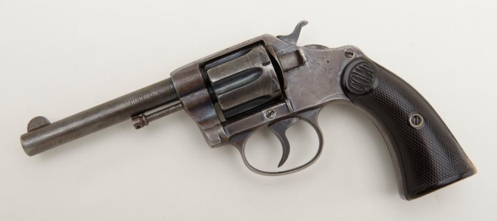 Colt New Police DA revolver, 1900 patent date, .32 cal., 4” barrel, blue finish, checkered hard rubber grips, #16300 in overall good condition showing traces of original blue in protected areas, good bore, good action, left grip shows an old repair on the rear toe. Est.: $150-$300.