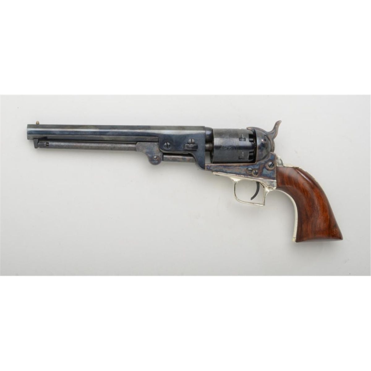 Colt New Series Blackpowder Model 1851 squareback Navy percussion revolver, blue and case hardened finish, wood grips, silver straps, #33427. This gun is in overall fine condition showing the majority of itsoriginal modern finish, some speckling and damage to the silver plating on the straps; otherwise nice; just in need of a little cleaning from long storage. Est.: $250-$500.