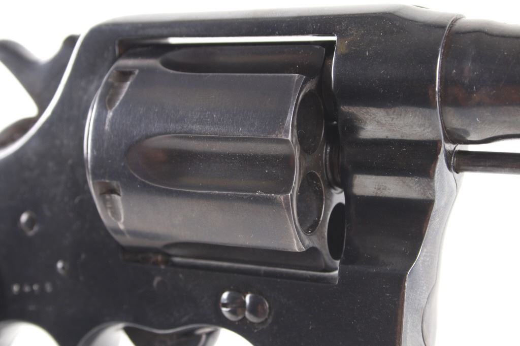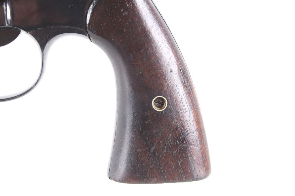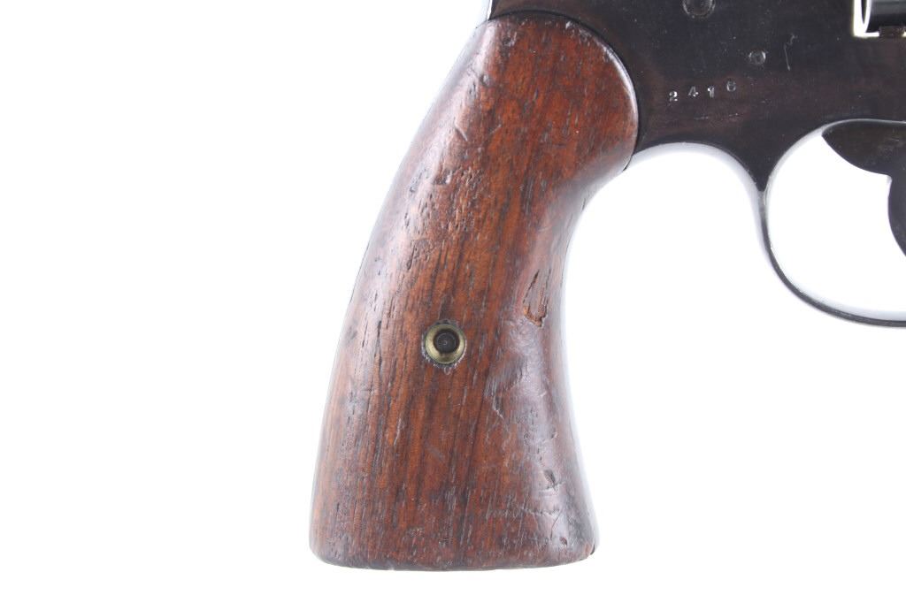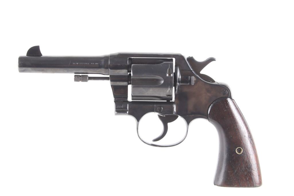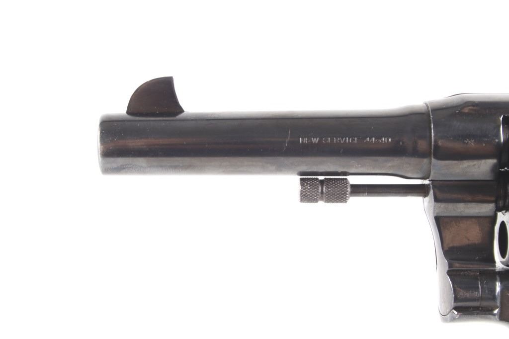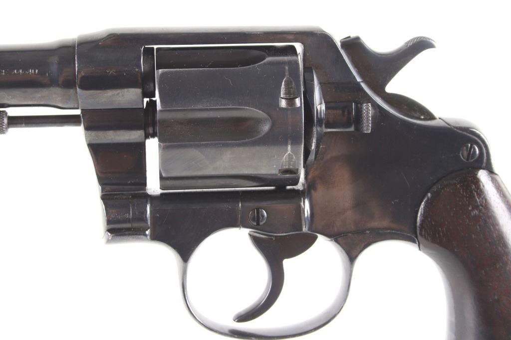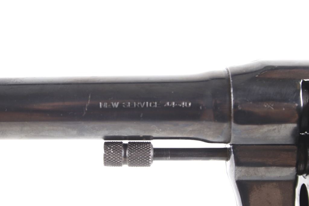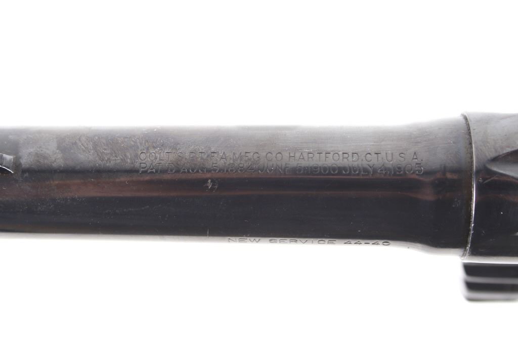 Featured in this lot we have a Colt New Service double action revolver chambered in .44-40 caliber. This revolver was manufactured in the early 1900's by Colt. The revolver displays a 4 1/2" long round barrel, six shot cylinder, walnut grips, double action trigger and hammer, and blue'd finish. The piece is marked across the barrel reading "NEW SERVICE 44-40" on the left side with the top reading "COLT'S PT FA MFG CO HARDFORD. CT USA PAT'D AUG, 5, 1884, JUNE, 5, 1900, JULY, 4, 1905". Mechanically the revolver shows strong springs, well timed action, and crisp trigger. The revolver shows good condition overall with minor wear across the finish with signs of use. The revolver weighs 2lbs 6oz. Serial Number: 105632. This firearm qualifies as a Curio & Relic firearm, and requires FFL Transfer or NICS Background Check.