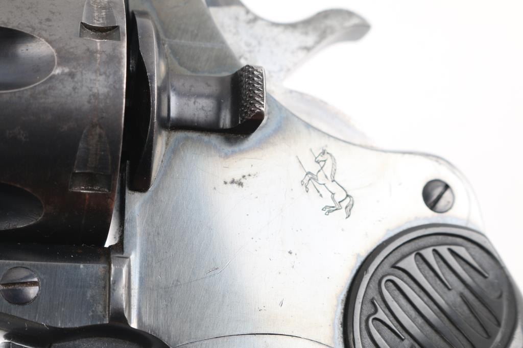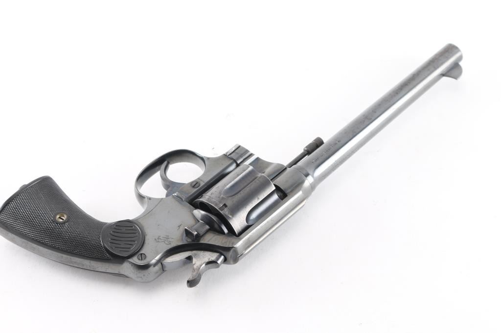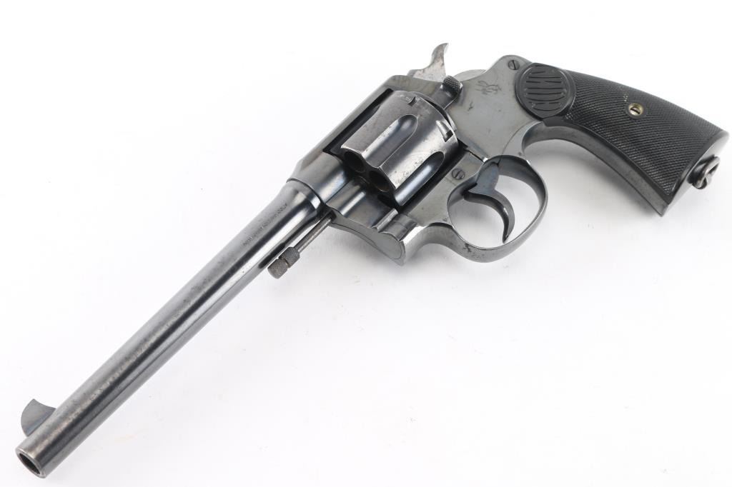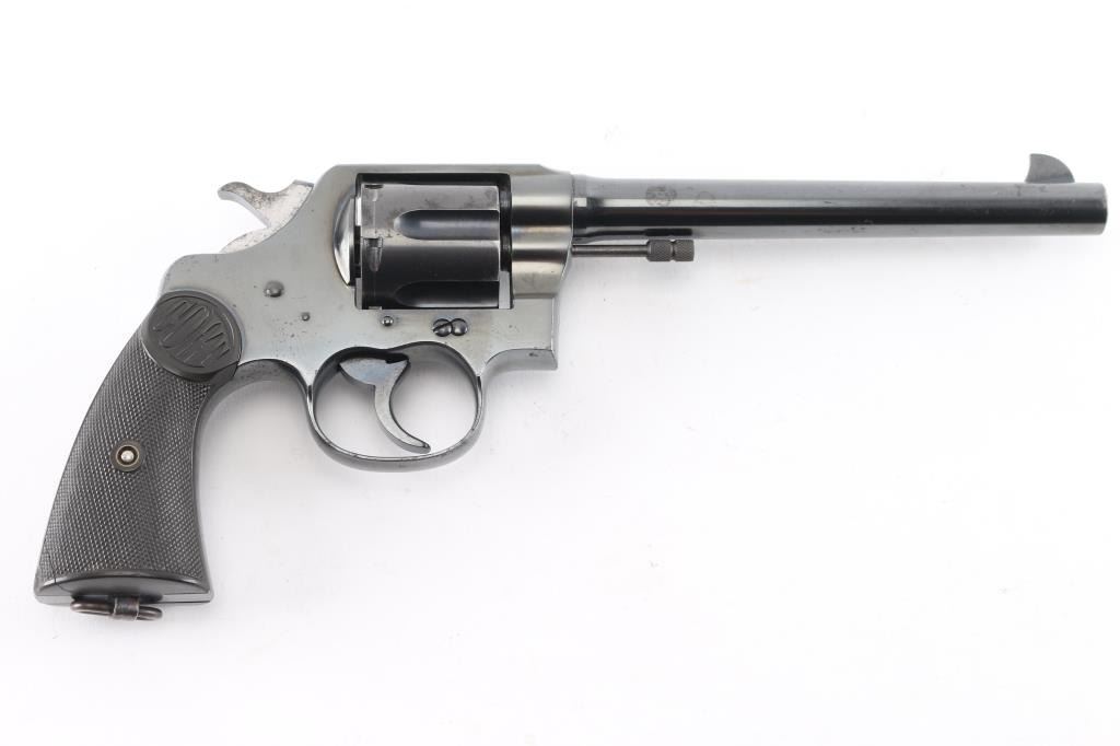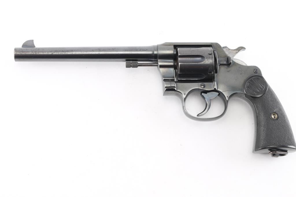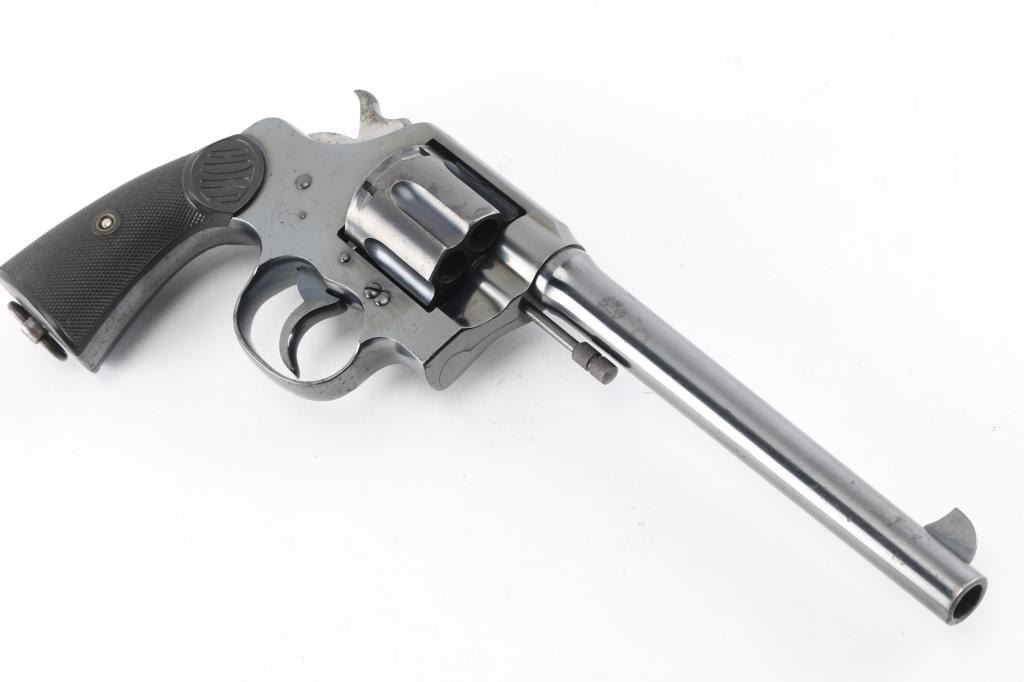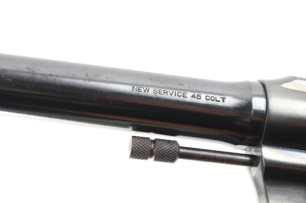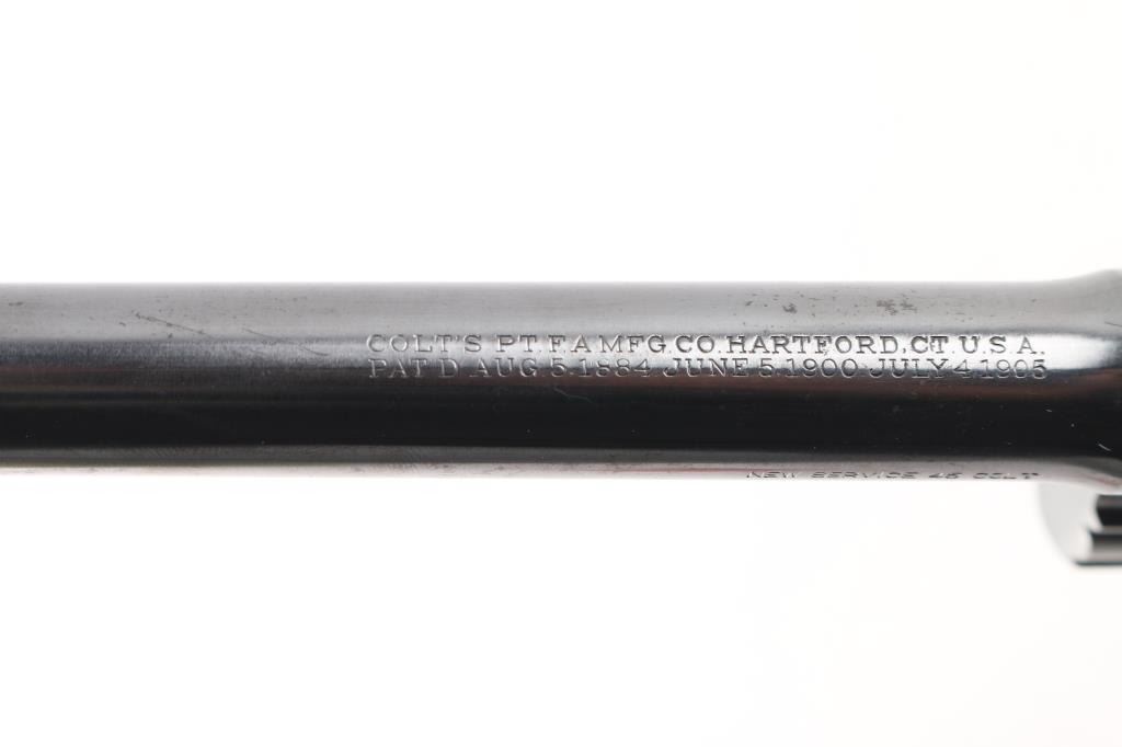 6-Shot Capacity. Large frame revolver produced 1898-1946. This one manufactured in 1924. 7 1/2" barrel, with fixed large blade front, and integral notch rear sights. Two line address/patent dates on barrel. "New Service 45 Colt" on left side of barrel .Rampant colt on left frame. Bore is excellent/bright. Checkered hard rubber grips with "Colt" motifs. Lanyard ring on heel. Blue finish with polished hammer sides. All markings are crisp/clear, Action is smooth with tight lock-up. Grips are overall very good, there is a very small chip/crack out of the lower rear right panel . Blued metal finish is about 90%, with some light holster/edge wear, light patina, tracking on the cylinder and minor scratches and the bore is overall very good/bright, strong rifling with a few very minor spots of light pits. Great condition for its age.NRA Condition-Good. C&R Firearm.