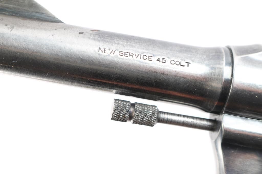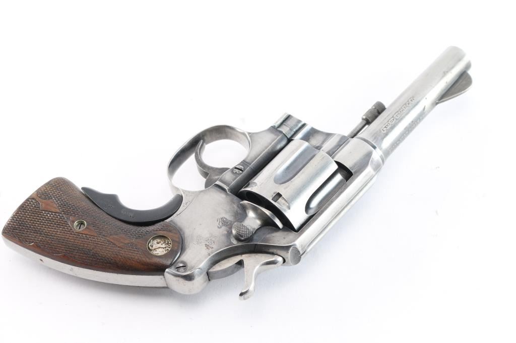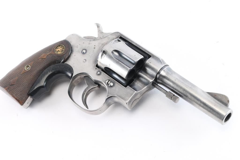 Vintage large frame double action revolver chambered in .45 Long Colt, manufactured circa 1929. It features a shortened 4 1/4" barrel, blade front sight (not original), frame notched rear sight, non-shrouded ejector rod, fluted six-shot cylinder, smooth curved trigger, checkered hammer spur, large square butt frame, Tyler T grip, and two-piece checkered/diamond hardwood grips with Colt medallions. The hole for the lanyard ring has been filled, and the bottom of the grip is serrated. Revolver retains almost none of its original finish because it has been 'cleaned.' The action is smooth with solid lock-up, and the bore is bright with strong rifling. There is a marking on the left side of the frame that appears to be a 'D' with a slash. The wood grips are very good with a few handling marks.