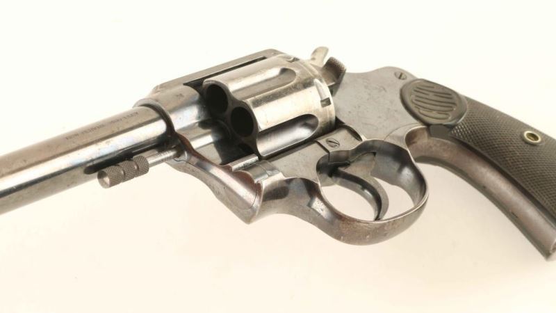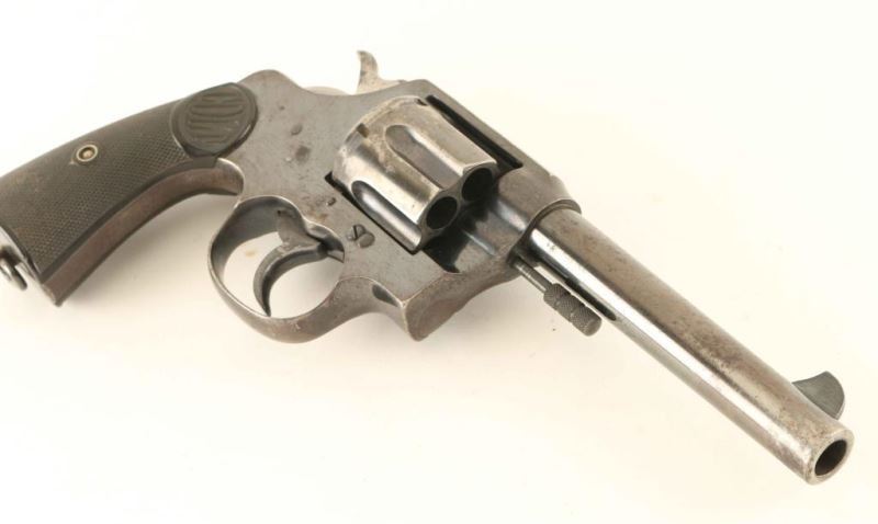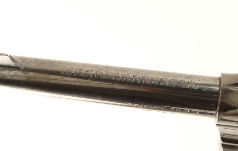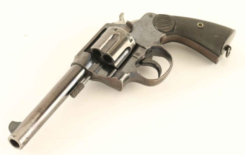 WWI Era British military large frame double action service revolver chambered in .455 Eley, manufactured circa 1915. Features a blued finish, 5.5" bbl, blade front sight, 'u' notched rear sight, non-shrouded ejector rod, fluted six-shot cylinder which measures 1.641" long, smooth trigger, knurled hammer spur, large square butt frame and two-piece checkered black hard rubber grips with COLT decor of the top of the panels. Shows British proofs and "JP Spowart/RE/2/LT" scratched lightly into the side plate. Revolver retains approximately 80% of it's original bright blued finish showing holster wear and handling marks. Action is smooth with solid lock-up, the bore is bright with some minor rust or pitting, markings are crisp and the matching hard rubber grips are very good. Condition is NRA Good to Very Good. ***C&R Firearm*** From The John F Sukey Collection