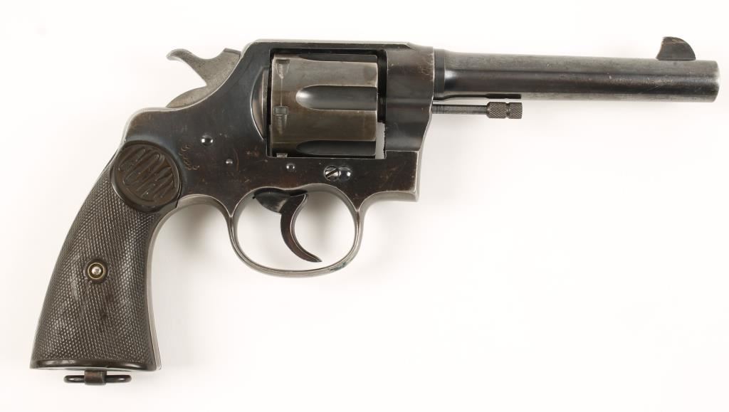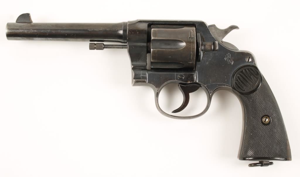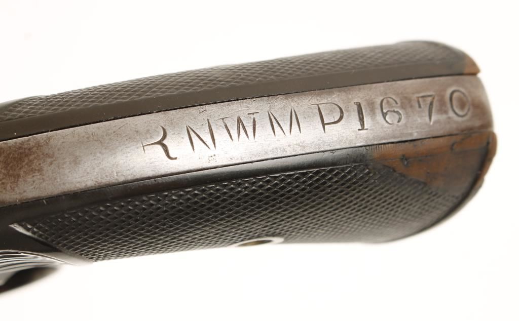 Blued double-action 6-shot revolver with a 5-1/2" barrel. Finish is fading to grey with edge wear , dings and scratches. Roll-stamps are sharp. Backstrap stamped "RNWMP 1670" for the Royal North West Mounted Police which preceded the Royal Canadian Mounted Police or "Mounties". Bore is bright and shiny and the chambers are clear of any deficiencies. Checkered black hard rubber grips have a repaired corner, a few small dings and overall wear. Function is flawless. Condition is good. *Modern Firearm*