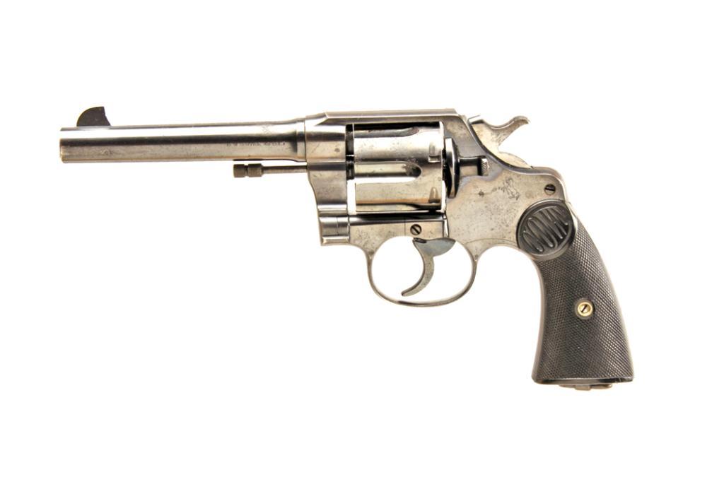 Colt New Service Cal .45LC SN:142872 This new service shows factory 5 1/2" barrel, blue finish, hard rubber grips, lanyard end butt, action good, bore bright, 85-95% original blue, some slight erosion and pin prick pitting. Grips are very good, frontThis new service shows factory 5 1/2" barrel, blue finish, hard rubber grips, lanyard end butt, action good, bore bright, 85-95% original blue, some slight erosion and pin prick pitting. Grips are very good, front sight is full height. Anexceptional New Service.