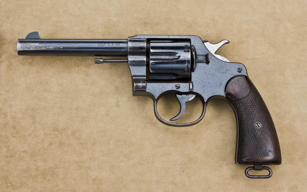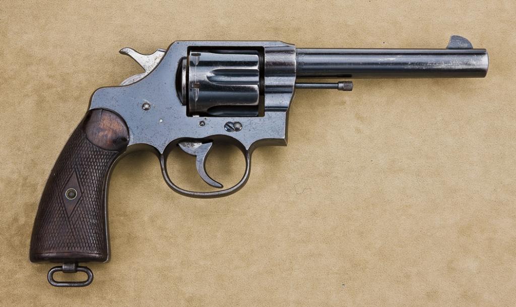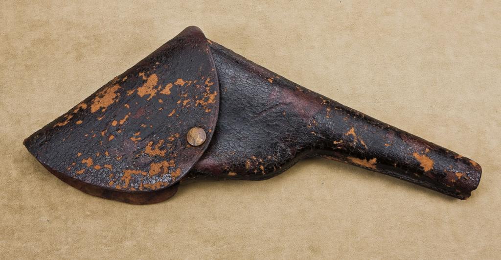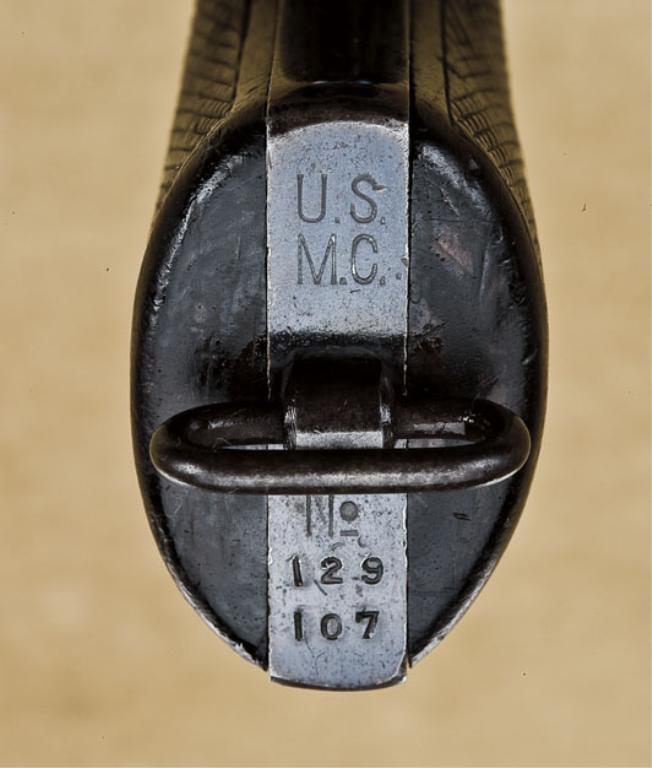 Colt New Service DA USMC-marked revolver (USMC marking on butt strap), .45 cal., 5-1/2” barrel, blue finish, checkered wood stocks, lanyard ring, #129107. This gun is in overall very good condition showing approx. 70% original finish, very good bore, crisp action, sharp markings, worn but complete grips. Factory letter confirms features except type of stocks “Not listed”. The gun was shipped to the Commanding Officer of Camp Bowie, Fort Worth, Texas on November 6, 1918, 28 guns in shipment. Accompanied by a USMC-marked military flap holster that is for a .38 DA but is still a nice display piece; in overall fair condition with cracking and scattered flaked areas. Est.: $1,500-$3,000.