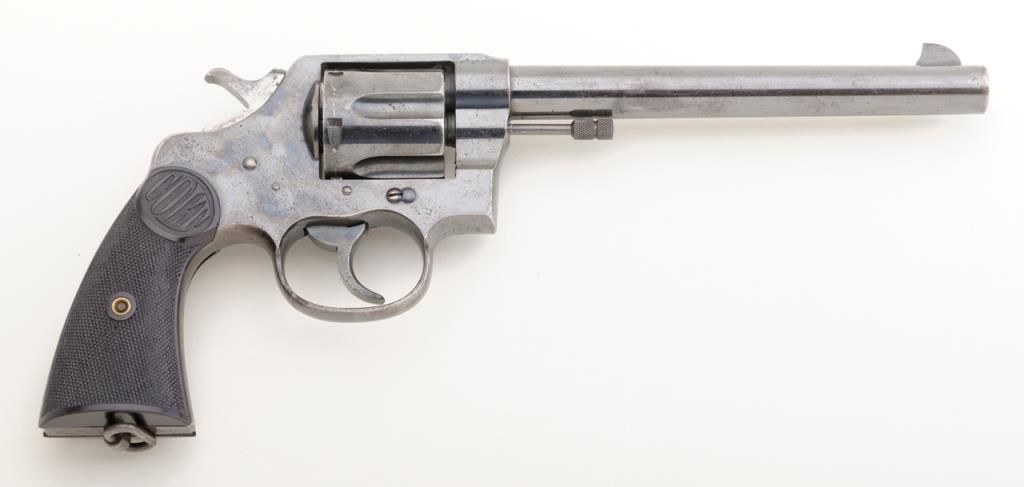 Colt New Service DA revolver, .38-40 cal., 7-1/2” barrel, high polish blue finish, early checkered hard rubber grips, lanyard ring, #60985 in overall fine condition showing the majority of its original finish, very good to fine bore, crisp action, sharp markings, fine grips that are slightly oversized for this gun. Consignor states phone call to Colt indicated shipment to Van Camp Hardware & Iron Co., Indianapolis, IN for Lawrence May on Feb. 27, 1914, .38/40, 7-1/2”, blue finish, stocks “not listed”, 1 gun in shipment (no factory letter). Est.: $1,400-$2,800.