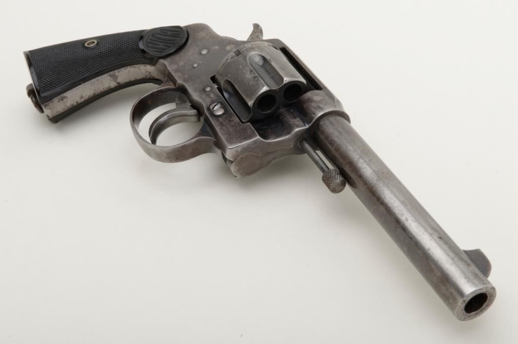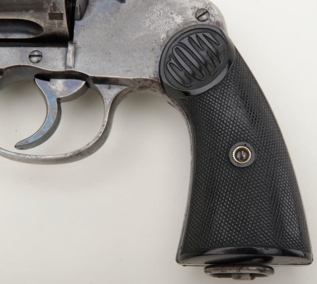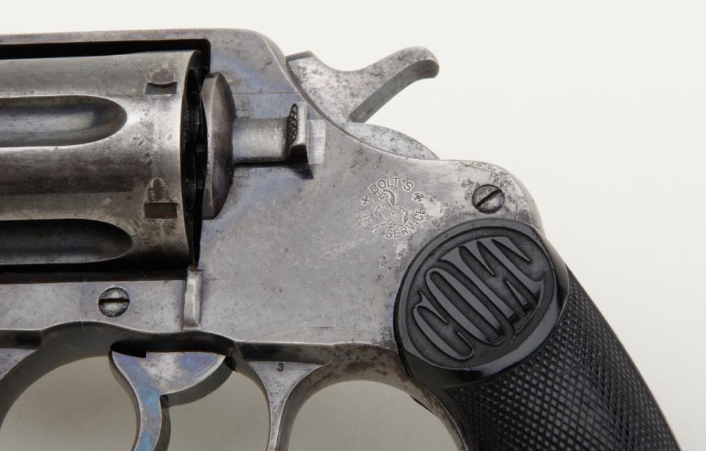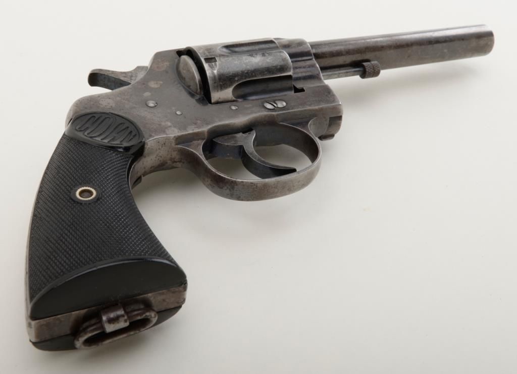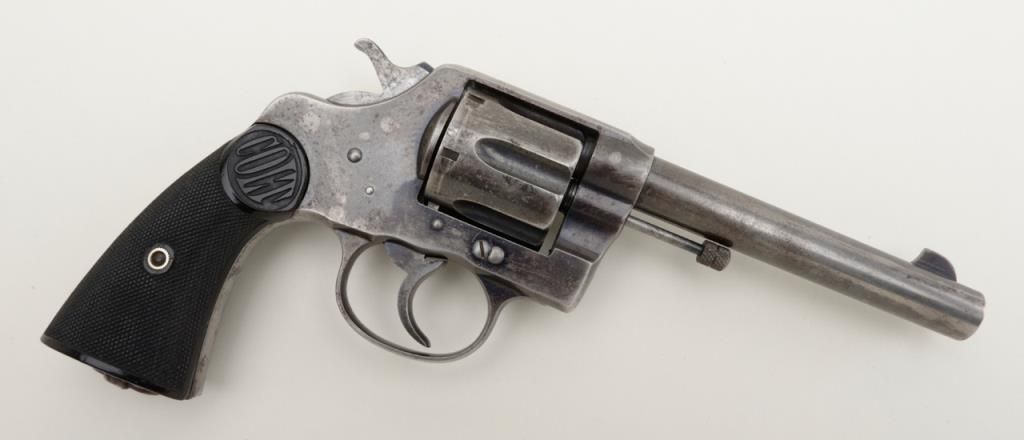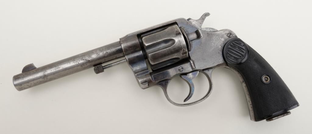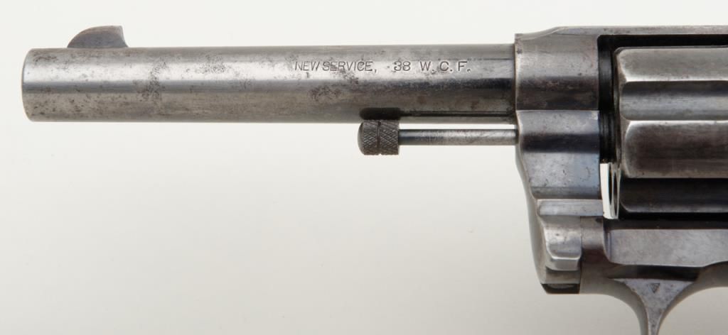 Colt New Service DA revolver, .38 W.C.F. cal., 5-1/2” barrel, blue finish, checkered hard rubber grips, lanyard ring, #15445 in overall very good condition showing approx. 20% original finish confined primarily to protected areas, good bore, action, markings and grips. Est.: $350-$650.