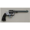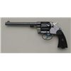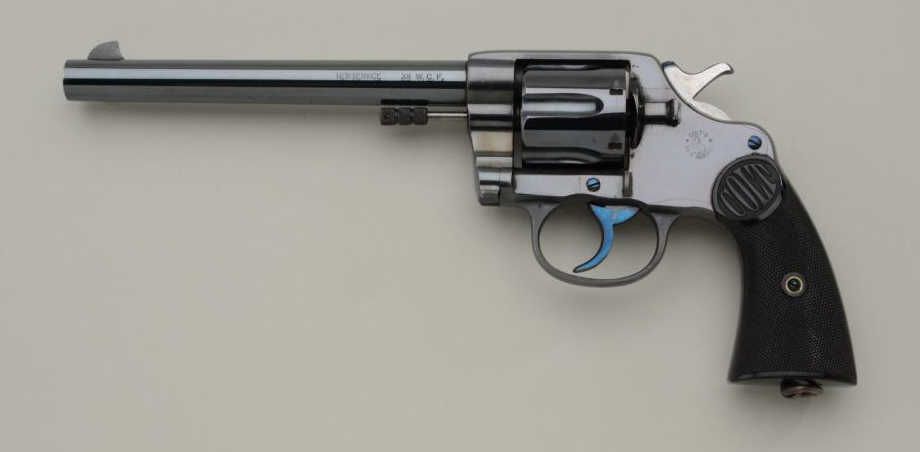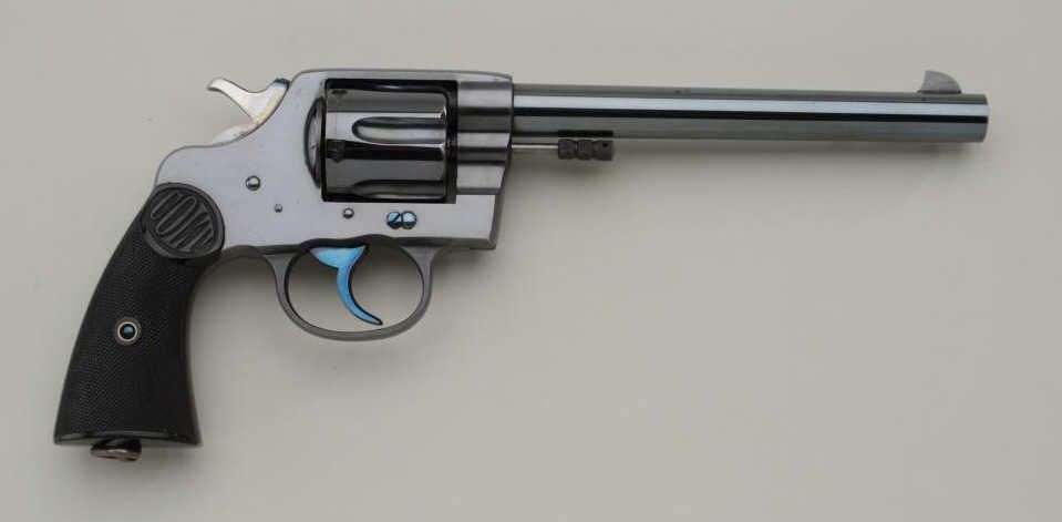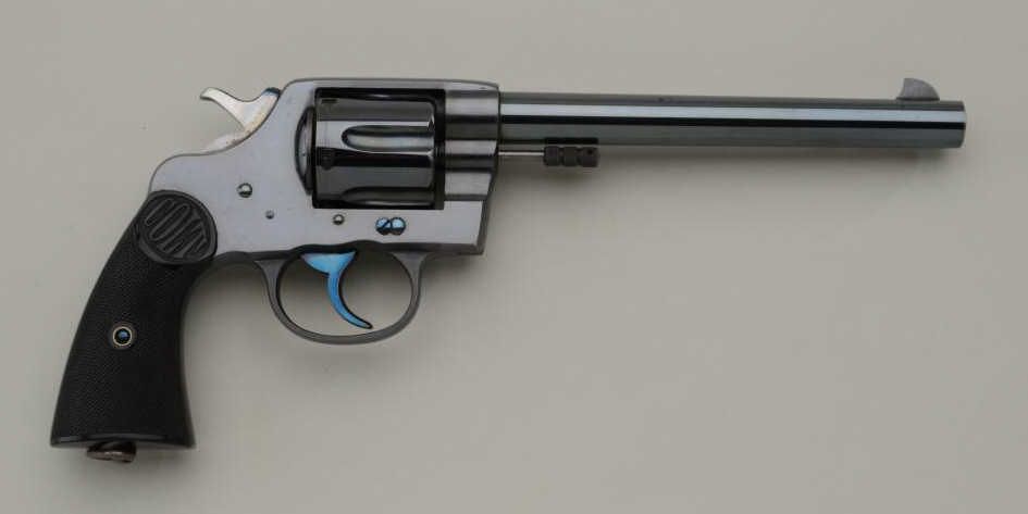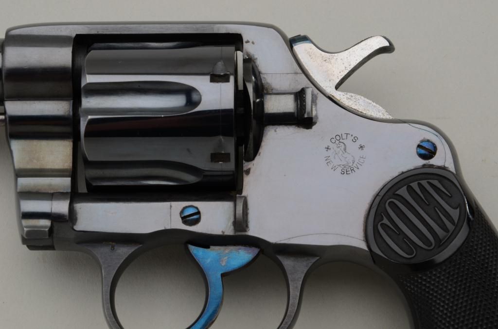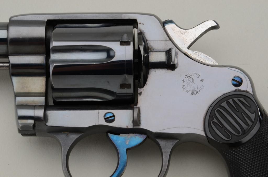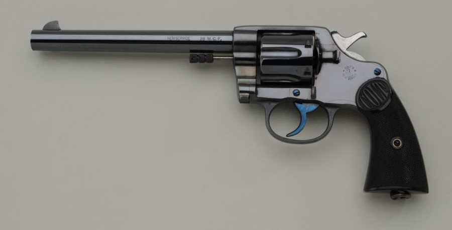 Colt New Service DA revolver, .38 W.C.F. cal., 7-1/2” barrel, blue finish, checkered hard rubber grips, lanyard ring, #12690. This gun is in overall excellent condition showing approx. 98% orig. high polish bluefinish, fine bore, sharp markings, fine grips, crisp action although the cylinder stop lug that is actuated by the trigger is not working and need repair; one of the nicest early New Service Colts we’ve seen insome time. Est.: $1,500-$3,000.