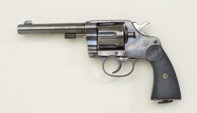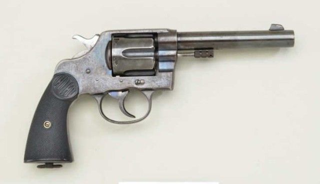 Colt New Service DA revolver, .38 WCF cal., 5-1/2” barrel, blue finish, checkered black hard rubber grips, #16539. This gun is in overall very good to near fine condition showing approx. 35% original finish withbalance gone to a plum brown patina, very good bore, crisp action and markings, very good grips. Est.: $600-$1,200.