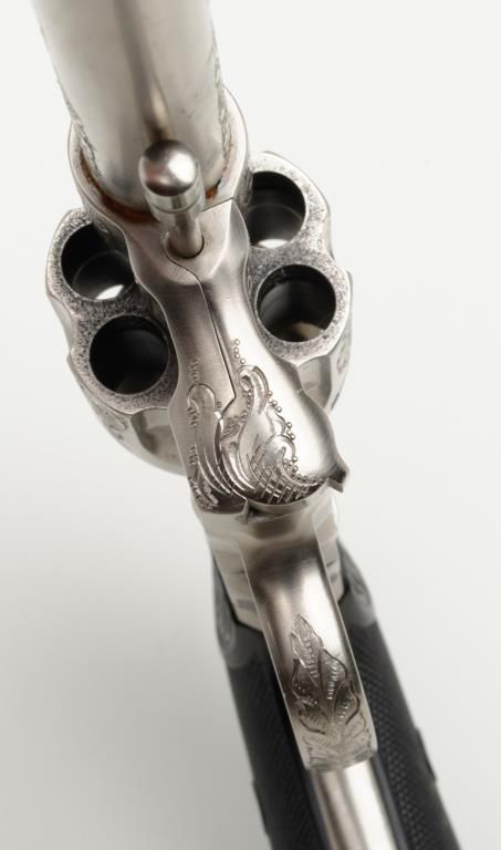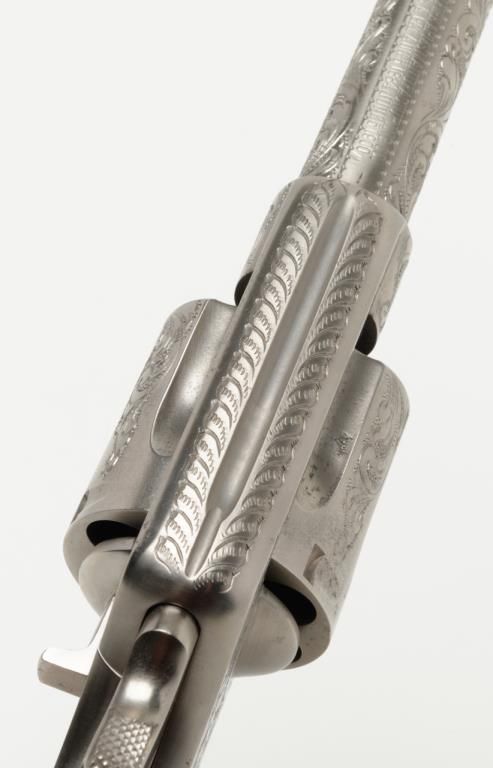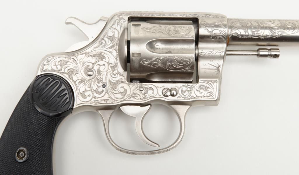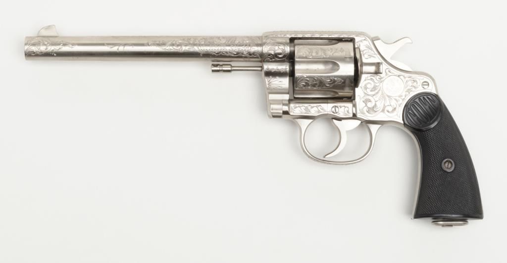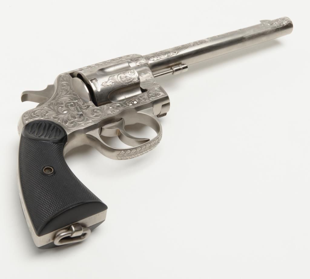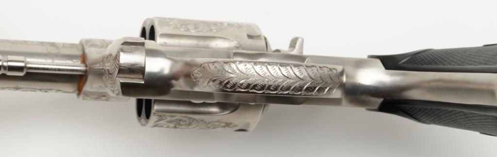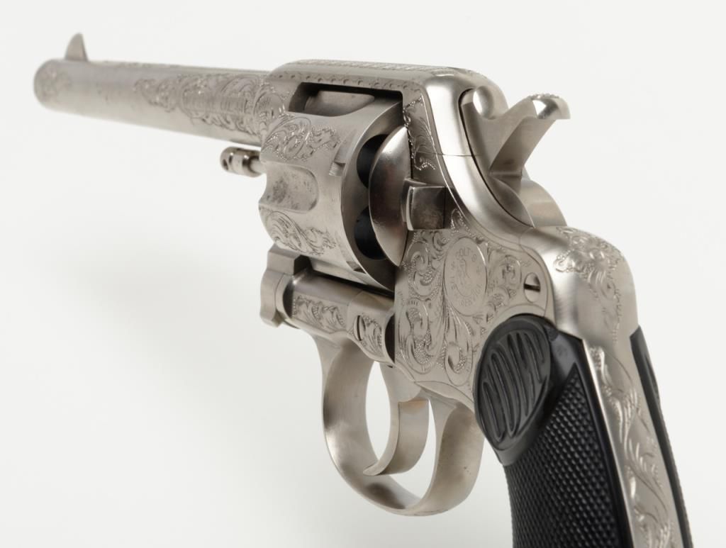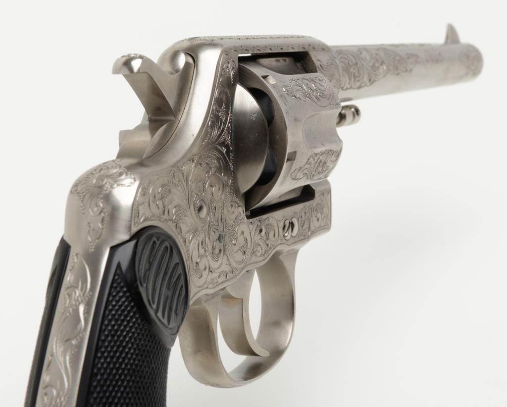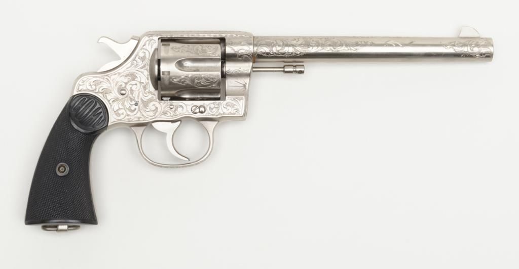 Colt New Service DA revolver, .44 cal., 7-1/2” barrel, nickel finish, checkered hard rubber grips, lanyard ring, #6269, custom engraved for our consignor by Master Engraver John Adams and signed by him on the butt strap withauthentication letter dated 11/4/2013 and signed by Mr. Adams. This gun is in overall fine condition showing extensive B+ engraving coverage, crisp action, sharp markings, fine grips and a very good bore; a true work of artistry in firearm engraving by one of the most recognized experts in his field. (C&R). Est.: $1,750-$3,500.