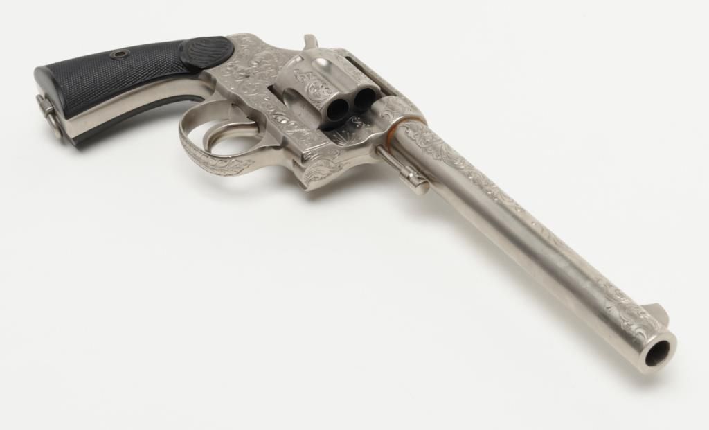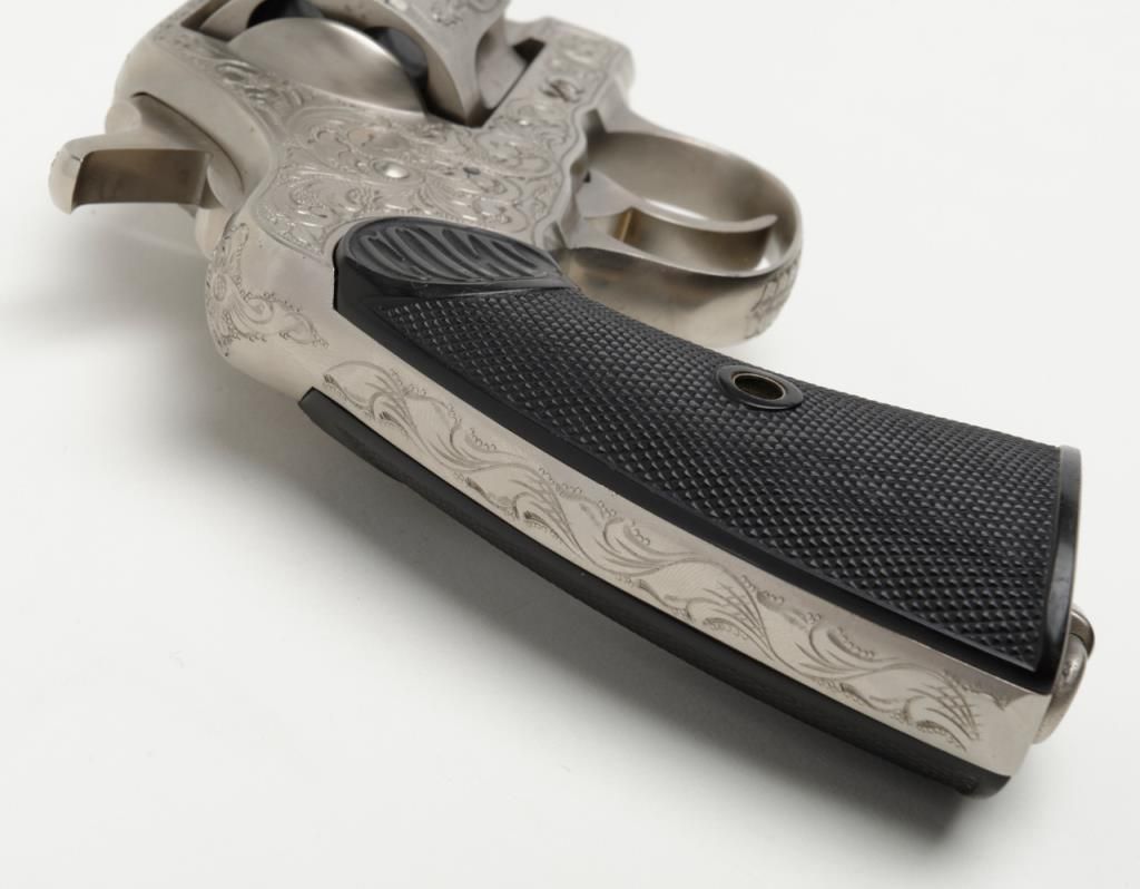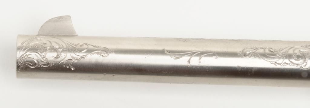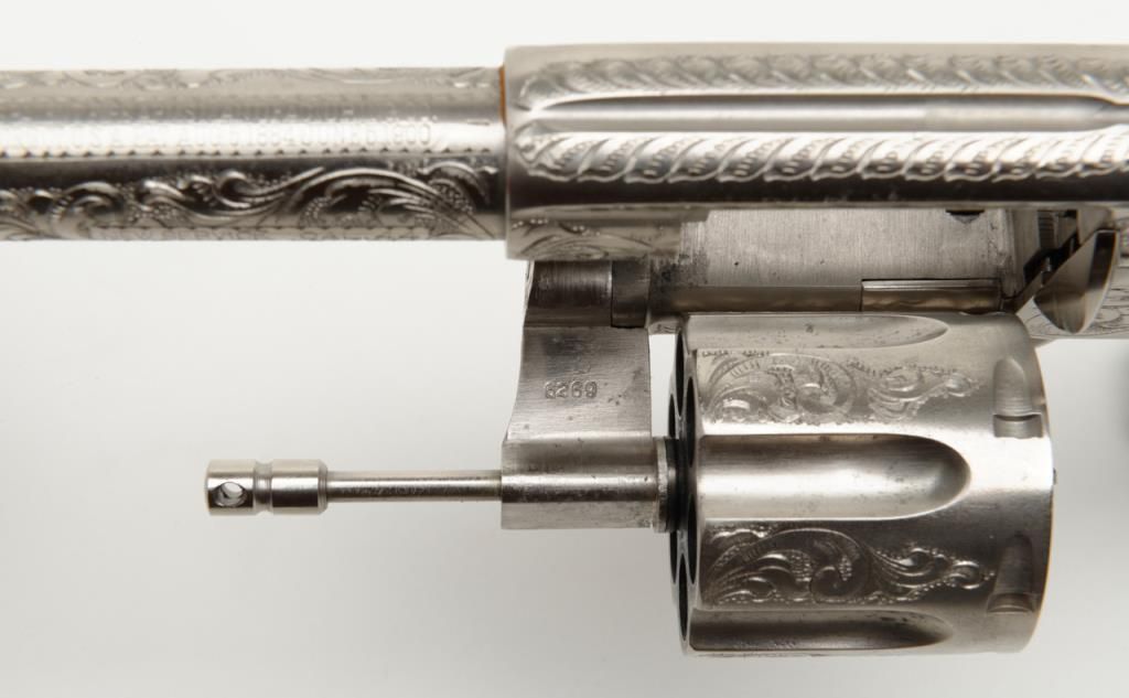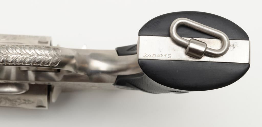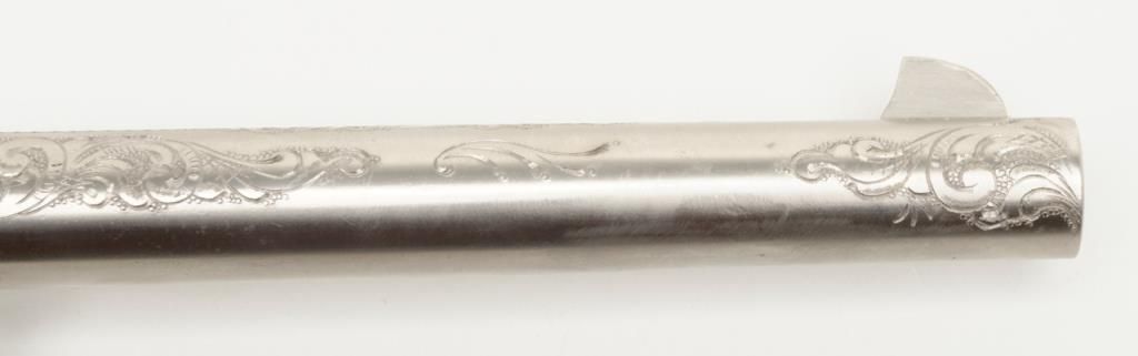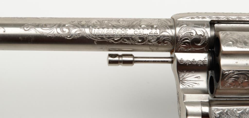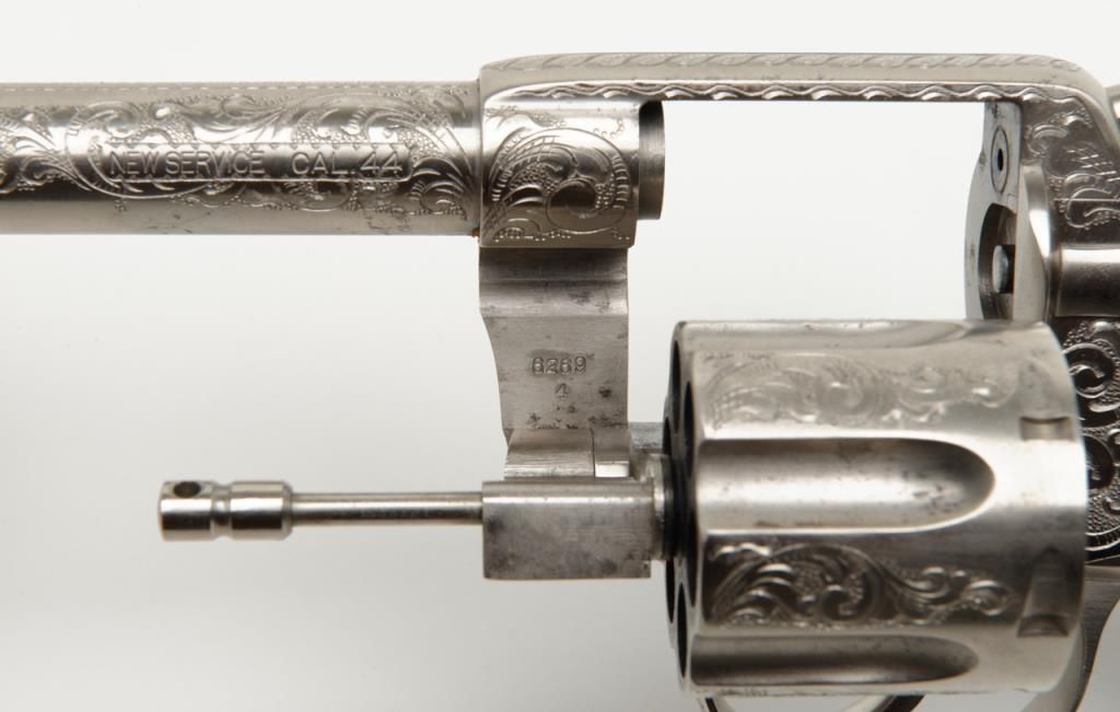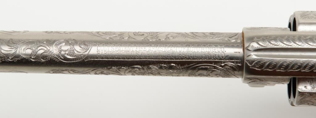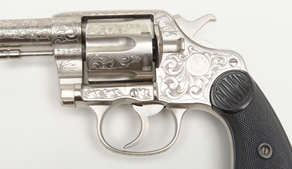 Colt New Service DA revolver, .44 cal., 7-1/2” barrel, nickel finish, checkered hard rubber grips, lanyard ring, #6269, custom engraved for our consignor by Master Engraver John Adams and signed by him on the butt strap withauthentication letter dated 11/4/2013 and signed by Mr. Adams. This gun is in overall fine condition showing extensive B+ engraving coverage, crisp action, sharp markings, fine grips and a very good bore; a true work of artistry in firearm engraving by one of the most recognized experts in his field. (C&R). Est.: $1,750-$3,500.