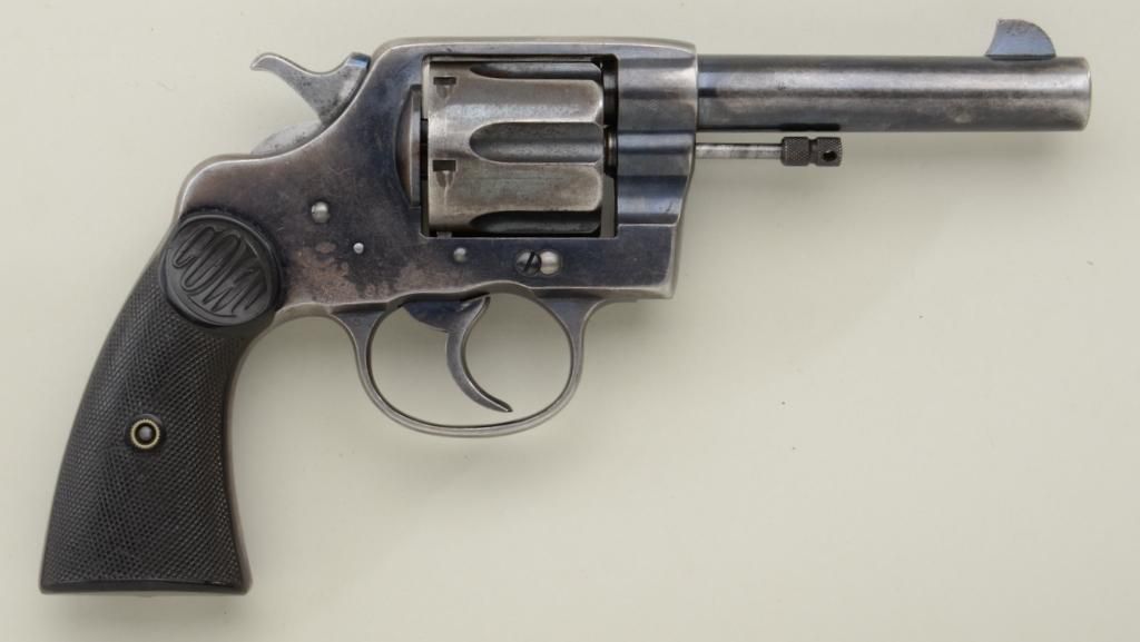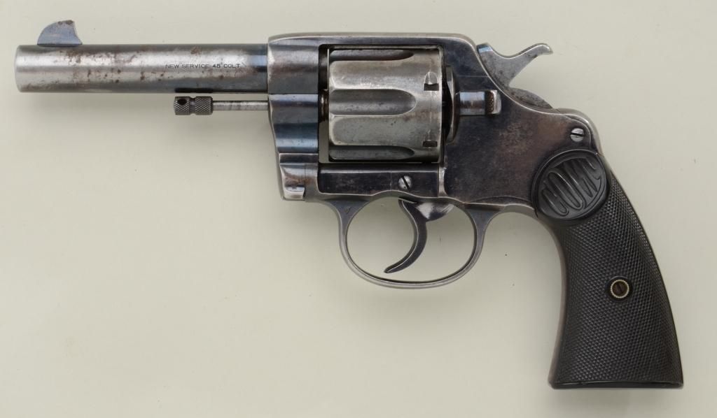 Colt New Service DA revolver, .45 Colt cal., 4-1/2” barrel, blue finish, checkered black hard rubber grips, #14101. This gun is in overall very good condition showing approx. 30% original finish, some spots of erosion,good bore, action and markings; grips are overall very good; lanyard ring has been cut off. Est.: $350-$700.