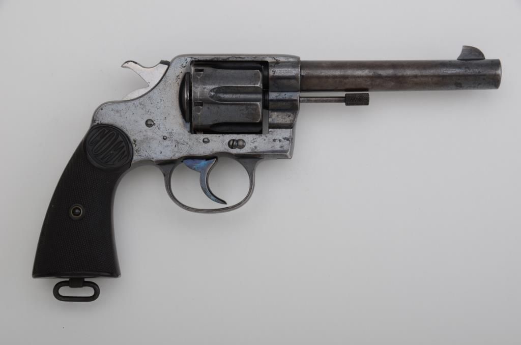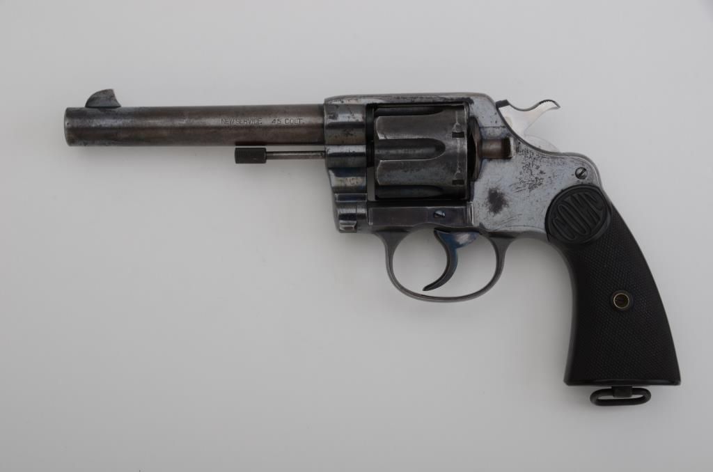 Colt New Service DA revolver, .45 Colt cal., 5-1/2” barrel, blue finish, checkered hard rubber grips, lanyard ring, #12279. This gun is in overall very good + condition showing approx. 40% original finish with severalspots of erosion, very good action, sharp markings, bore shows a couple scattered pits, very good grips. Est.: $600-$1,200.