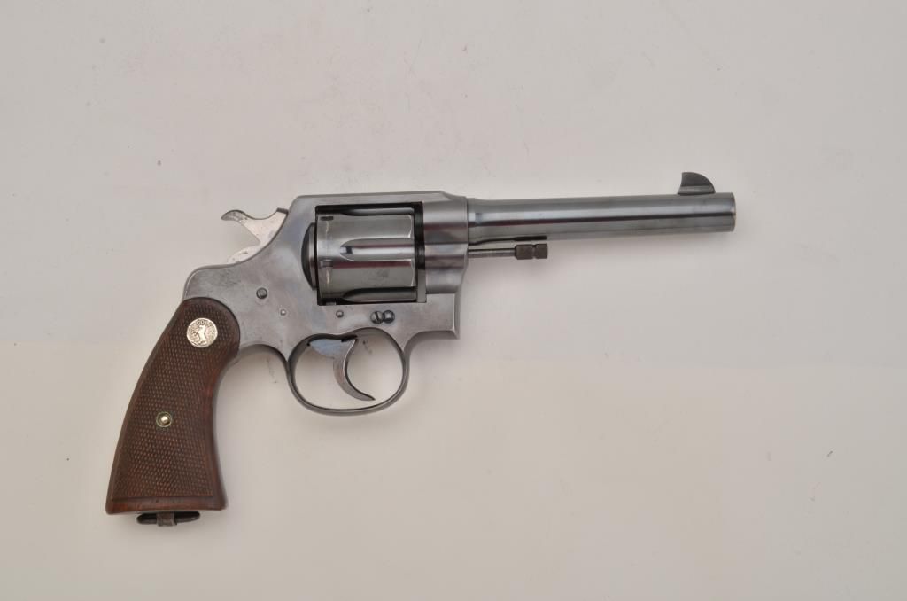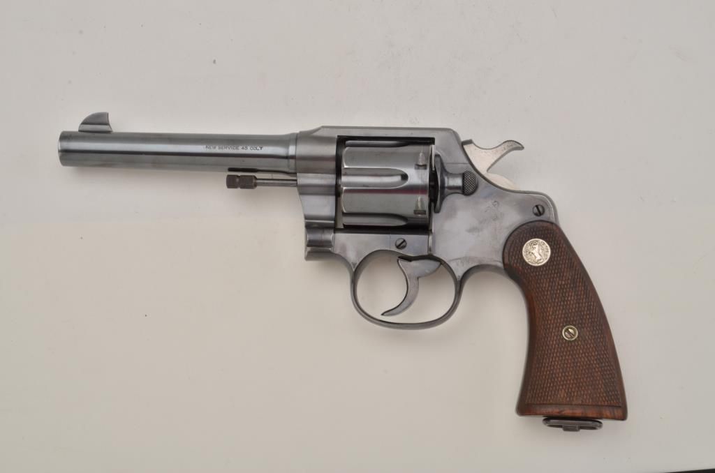 Colt New Service DA revolver, .45 Colt cal., 5-1/2” barrel, blue finish, checkered wood medallion grips, lanyard ring, #331704 in excellent condition showing little use or handling, just some high point wear; finebore, action, markings and grips. Est.: $500-$1,000.