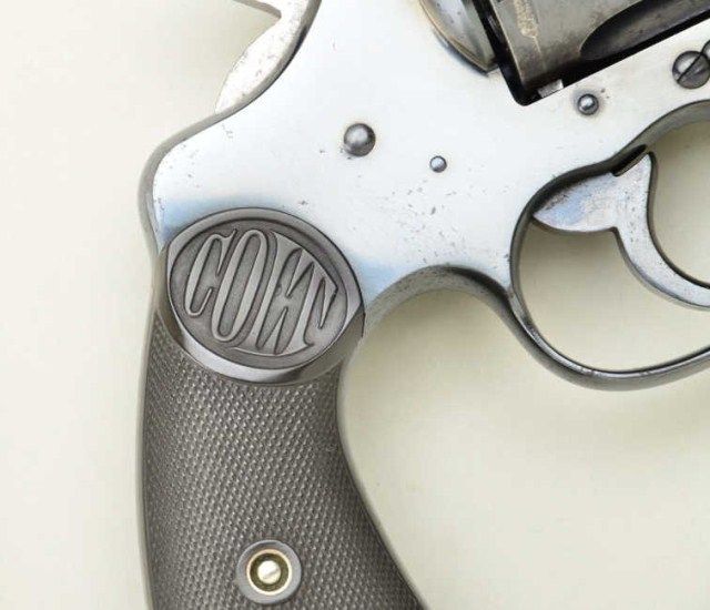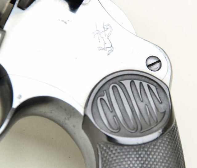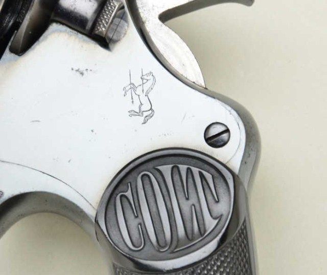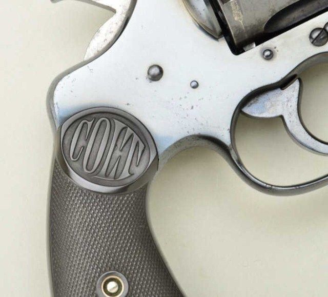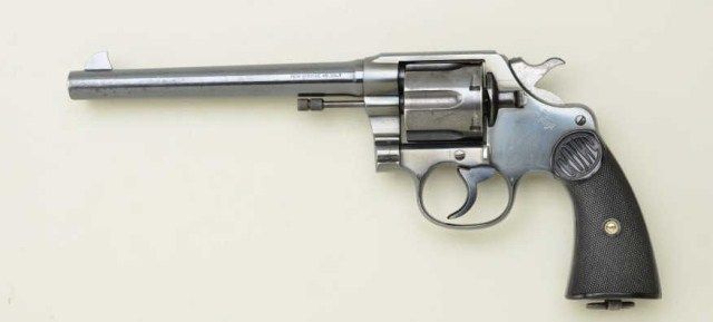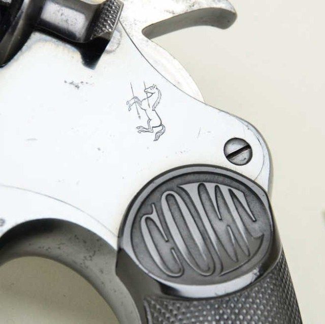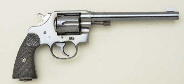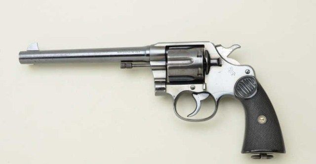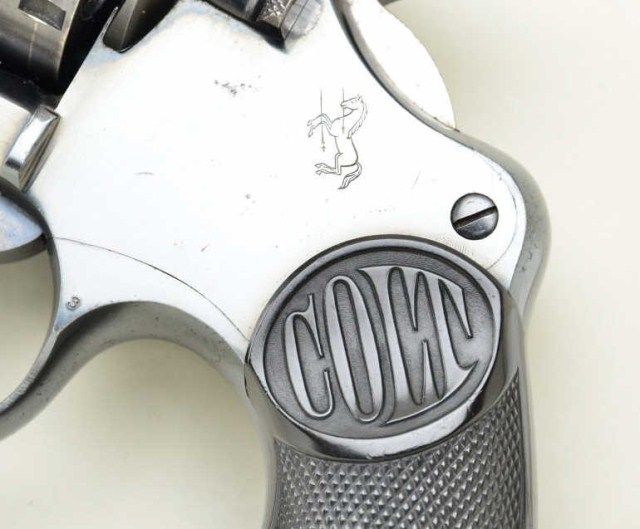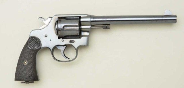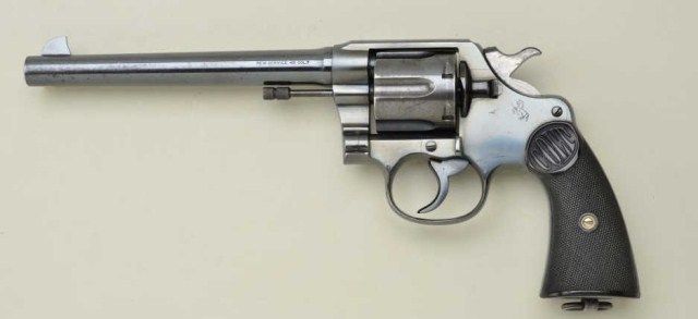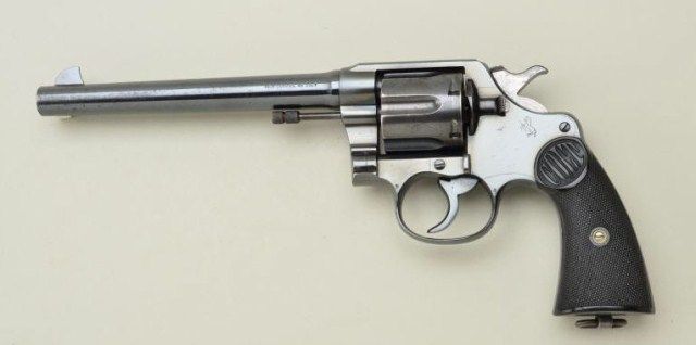 Colt New Service DA revolver, .45 Colt cal., 7-1/2” barrel, blue finish, checkered black hard rubber grips, #320205. This gun is in overall fine + condition showing the majority of its original finish with some high pointwear, fine bore and markings, action very good but dried old grease is making trigger return sluggish (easily remedied by a simple cleaning and oiling); grips are overall very good with an old repair to the back lower toe of the right grip. Est.: $1,200-$2,400.