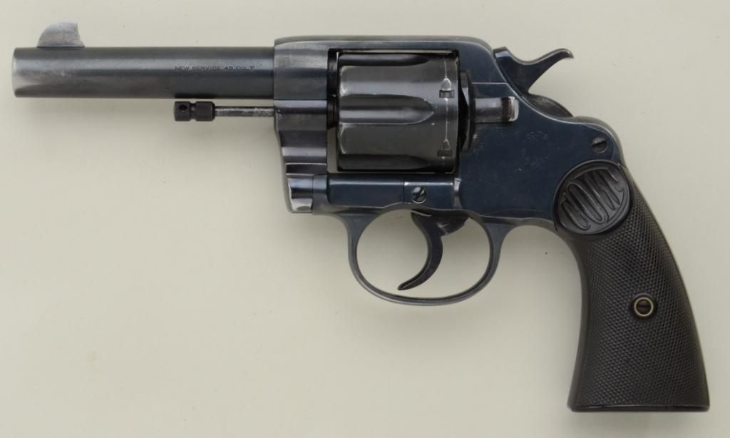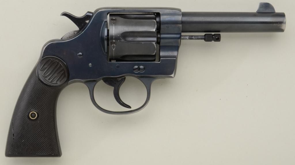 Colt New Service DA revolver, .45 Colt caliber, 4-1/2” barrel, re-blued finish, checkered black hard rubber grips, #13916. This gun is in overall good condition showing the majority of an old re-finish, some highpoint and muzzle wear, good action and markings, fair bore, good grips showing an old repair to the lower back of right grip; lanyard ring hole plugged. Est.: $300-$600.