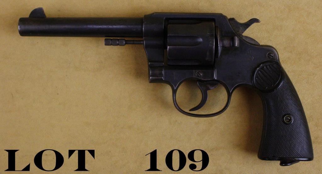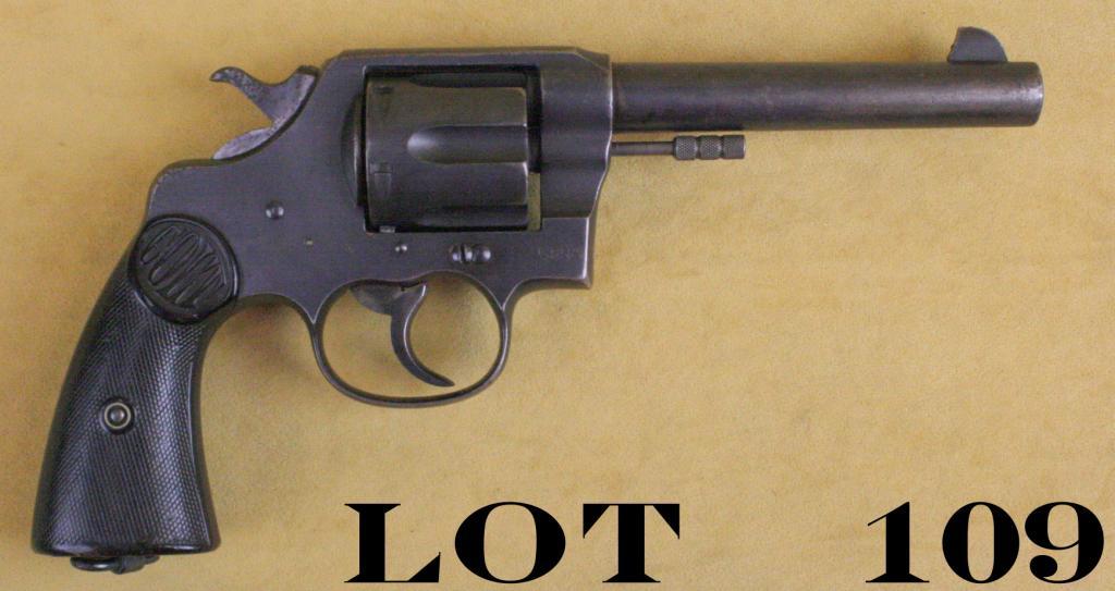 Colt New Service DA revolver, originally .455 Eley caliber converted to .45 Long Colt per re-stamp of left side of barrel, British proofed, 5-1/2” barrel, military mat blue finish, checkered black hard rubber Coltgrips, #113442, lanyard ring present. This gun is in overall fair + condition showing approx. 70% muted older military type re-finish, overall good bore and action; grips are fair + with a couple old lossesaround edges; “C558” stamped on the right front bottom of the frame, possibly a military or law enforcement inventory or rack number. Est.: $250-$350.