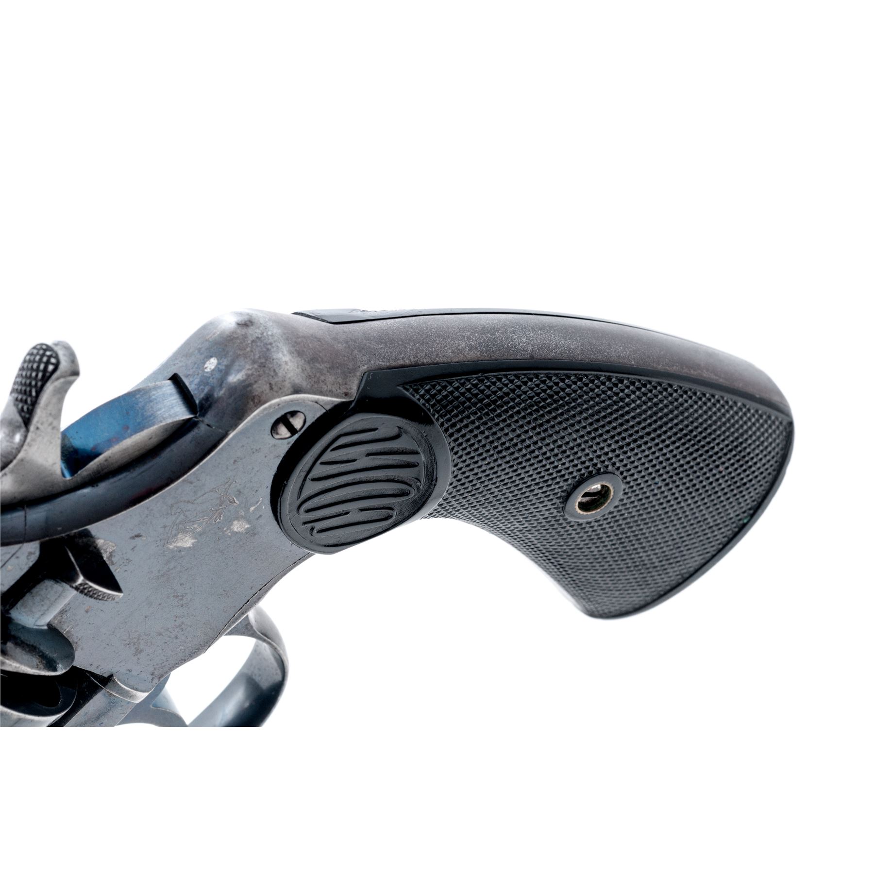 Colt New Service Double Action Revolver, #21312, .44-40 cal., 7.5'' barrel, high polish blue finish, factory checkered hard rubber grips, with lanyard loop in butt. Mfg'd 1909. Condition is very good retaining approx. 85% thinning blue. Nice screw slots. Light wear to grips. Crisp action, very good bore. Est.: $500-$750. (C&R/PPT)