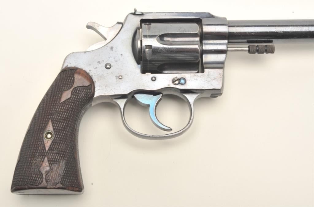 Colt New Service Flat Top Target DA revolver, .455 Eley caliber, 7.5” barrel, British proofed, blued finish, checkered straps and trigger, checkered fleur d’lis wood grips, S/N 20790, in overall very good to nearfinecondition showing the majority of its original high polish blued finish, scattered high point wear to finish and storage scratches and nicks, fine bore, crisp action, sharp markings and overall very goodgripswith some old compressions and nicks to the lower area of the right grip. (C&R/PPT). Est.: $1,750-$3,500.