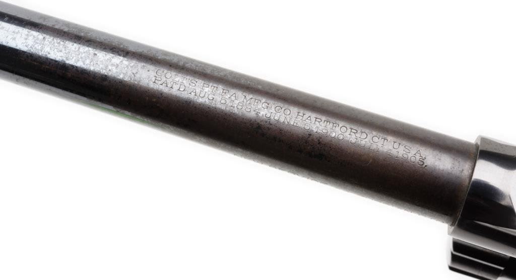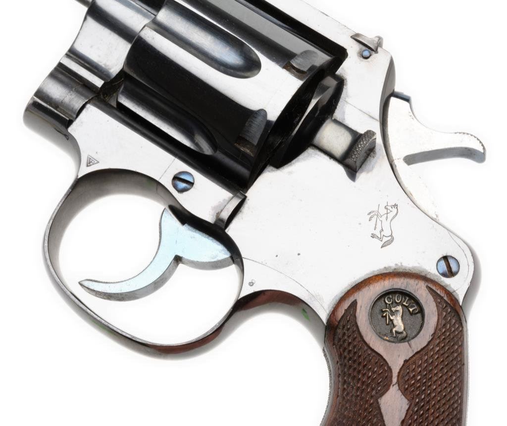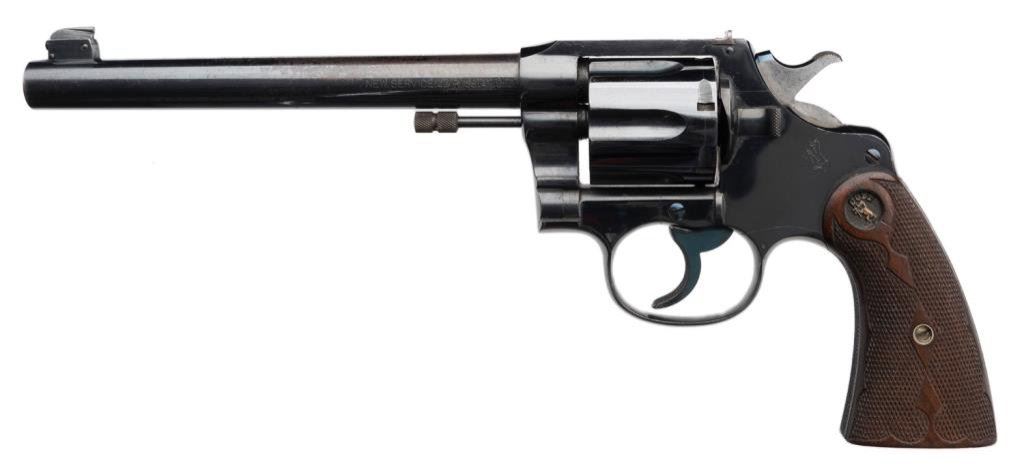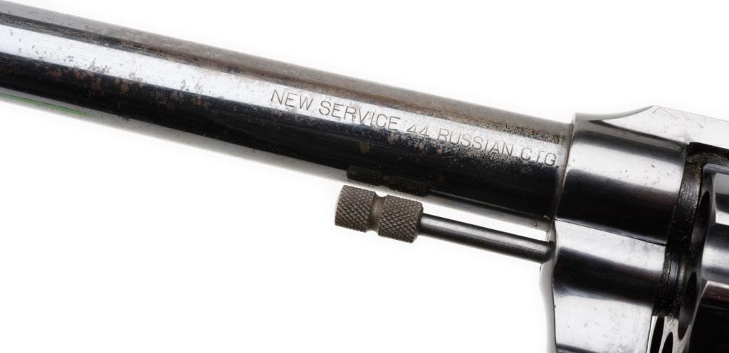 **Colt New Service Flat top Target DA revolver, .44 Russian caliber, 7.5” barrel, S/N 58516, high polish blued finish, checkered fleur d’ lis medallion wood grips, in excellent overall condition with some scattered flaking of finish to top rear portion of barrel that has gone to a brown patina; crisp action, markings and grips. Accompanied by a Colt factory letter confirming features with stocks “Not Listed”; shipped to Abercrombie & Fitch Co., NY, NY on April 8, 1913, one gun in shipment. Est.: $2,000-$4,000.