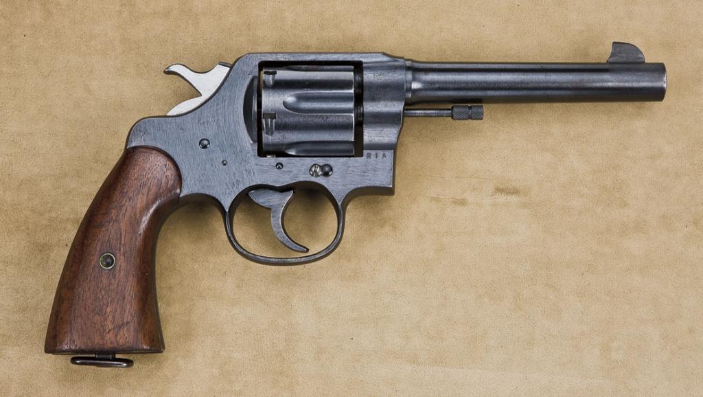 Colt New Service Model DA revolver, marked on butt “U.S.M.C. Model 1917 No. 294038”, .45 cal., 5-1/2” round barrel, military blue finish, wood grips, #294038 in crane area. This gun is in overall very good to excellent condition showing approx. 98% military finish with “UNITED STATES PROPERTY” stamped under the barrel, various inspector stamps including “RIA” on the bottom right side of the frame, rampant colt on the left side of the frame under the hammer, lanyard ring, fine bore, crisp action, sharp markings, very good grips with flaming bomb at top of left grip, and on bottom of right grip. The USMC stamping on the butt strap looks correct however this gun is not in the usual serial number range for the Model 1909, possibly a later arsenal change. No factory letter accompanied this military New Service from the consignor. Est.: $1,750-$3,500.