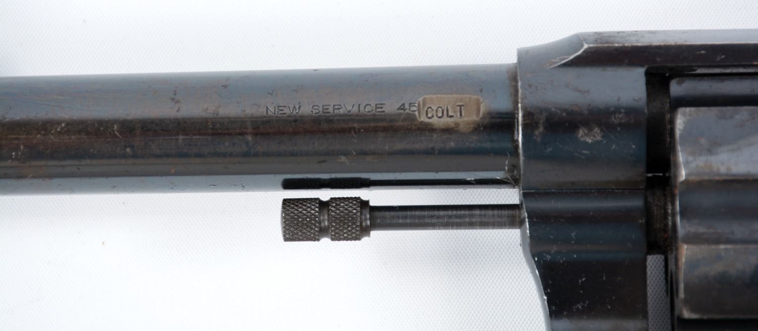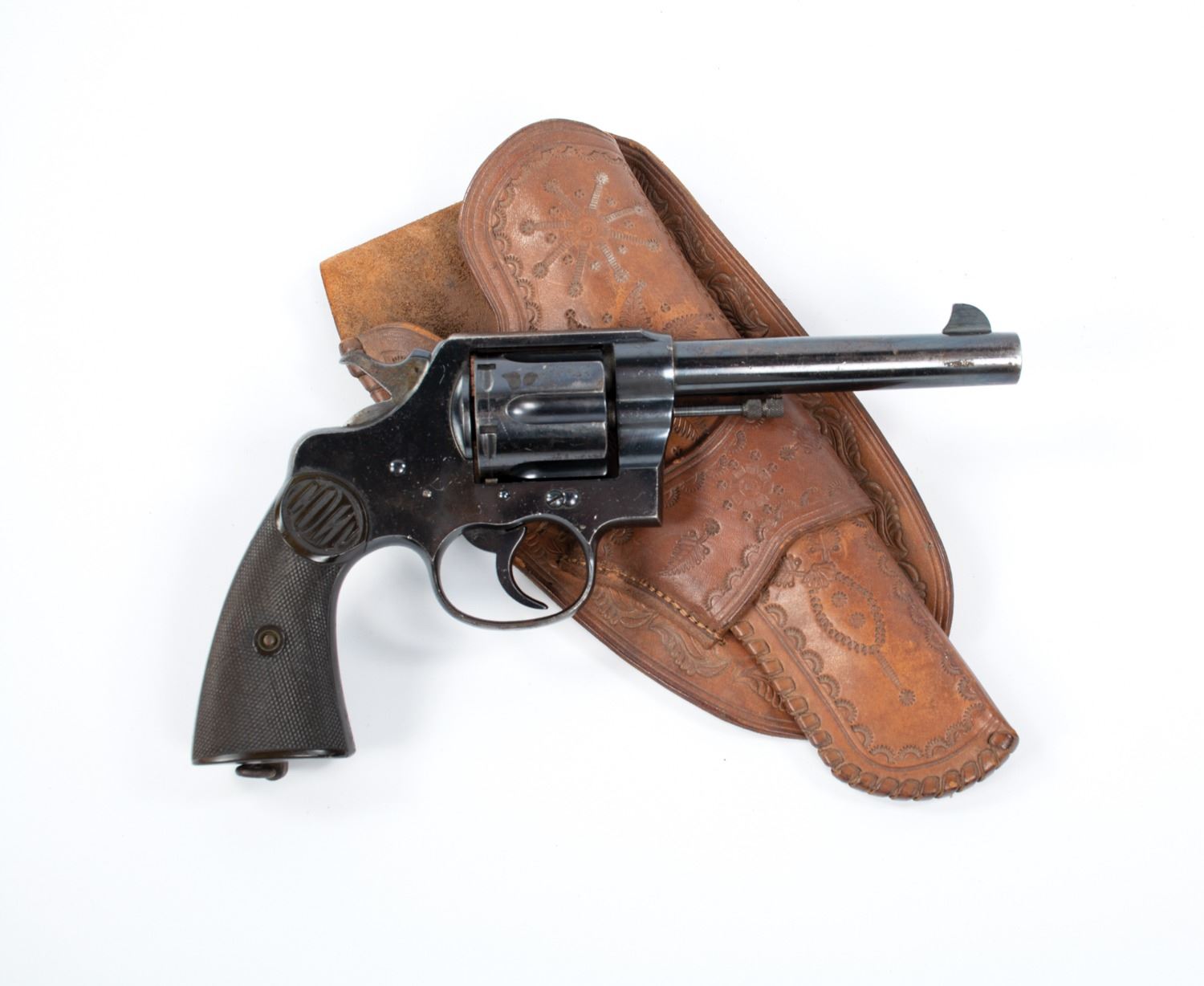 *S/N 91435, .45 Colt, 5 1/2 inch barrel, Colt New Service Revolver. Blued finish, Canadian proof marks, cylinder has been re-bored from .455 Eley to .45 Colt, 2 piece hard rubber grips. Circa 1915. Condition: 85% blue overall, excellent grips, excellent mechanically, caliber marking on barrel has been altered to reflect re-chambering, otherwise excellent marks. Holster is tooled single loop with laced edge, period to the revolver.