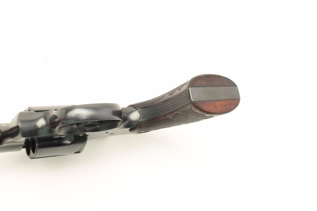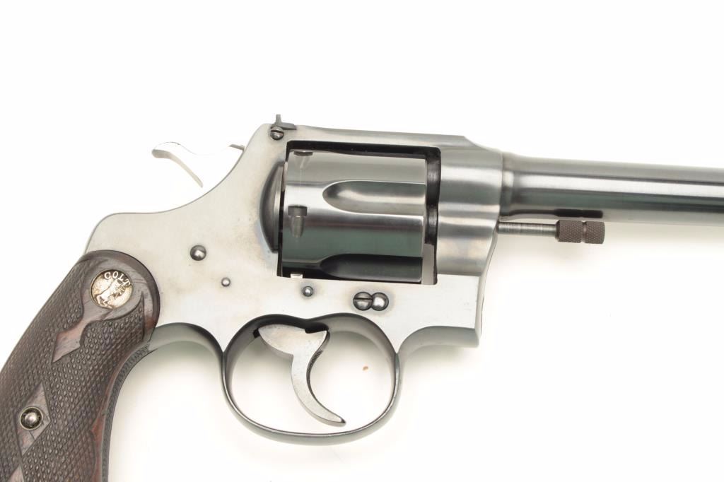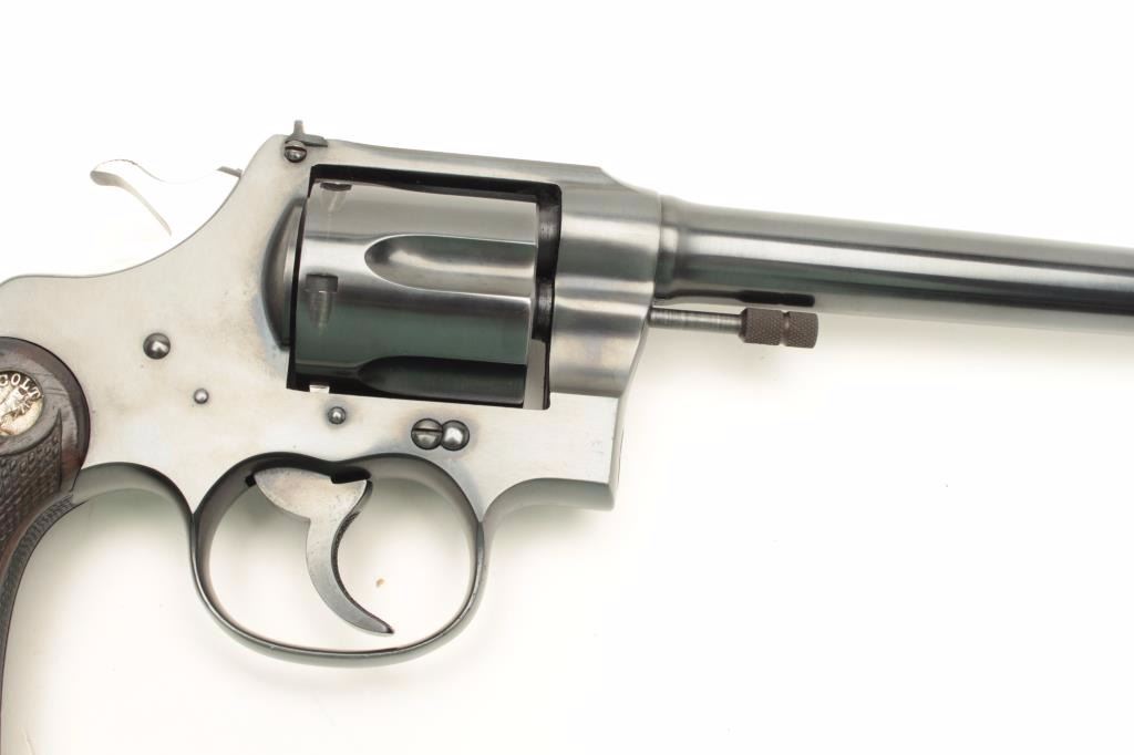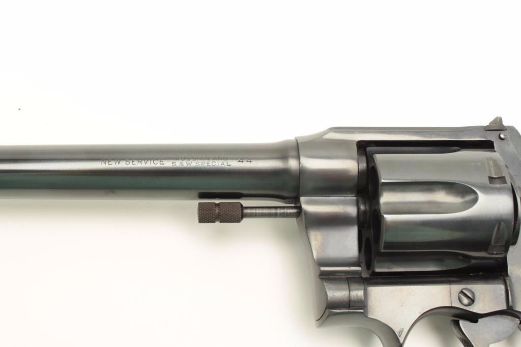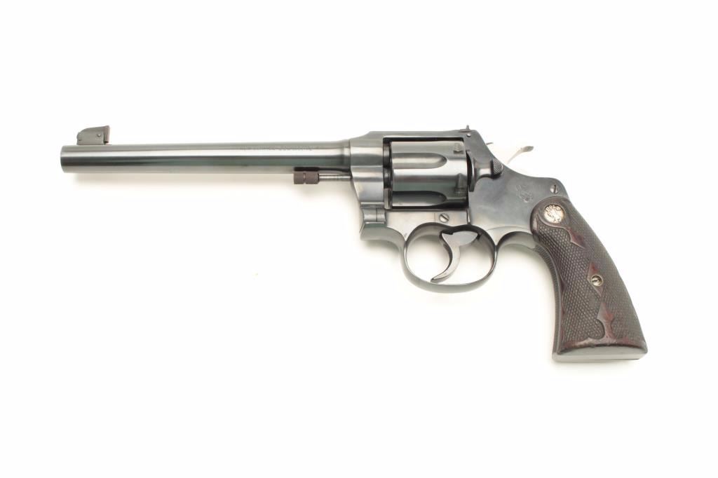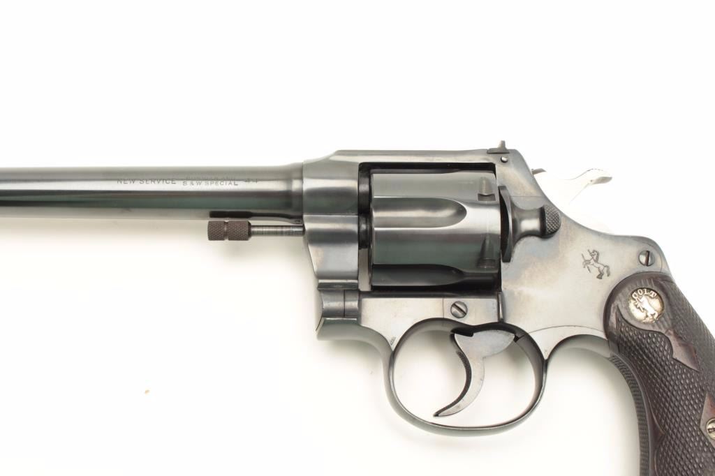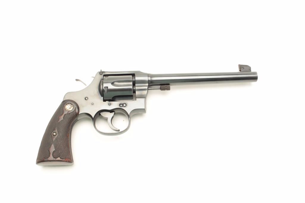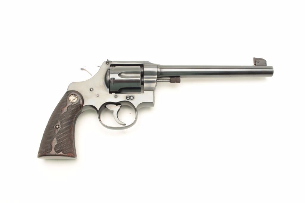 Colt New Service Target revolver, .44 S&W Special caliber, Serial #307318. The pistol is in minty overall condition as factory re-finished and rebuilt with a 7 ½” barrel. The pistol retains nearly all of a factoryre-finish with only light handling marks noted. The checkered wood silver medallion grips are in very good condition with small mars and compressions consistent with carry and use. The consignor notes indicate thepistol was assembled on July 16, 1920 in .45 Colt caliber. It was shipped on October 19, 1920 to an unspecified dealer. The pistol returned to the factory sometime after 1926 where it was rebuilt in .44 Special. Thebore is very good, the markings are sharp and action crisp on this fine New Service from the collection of Gil Newton. Est.: $1,400-$2,800. (C+R).