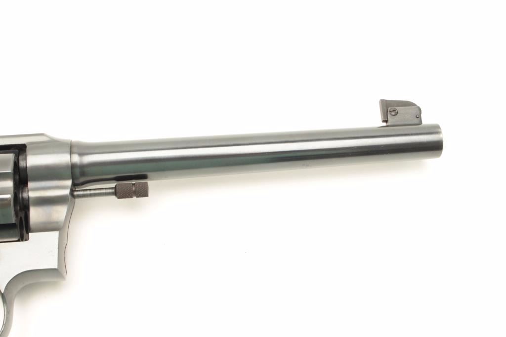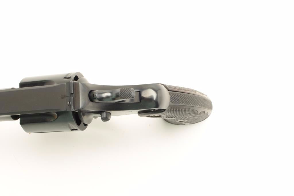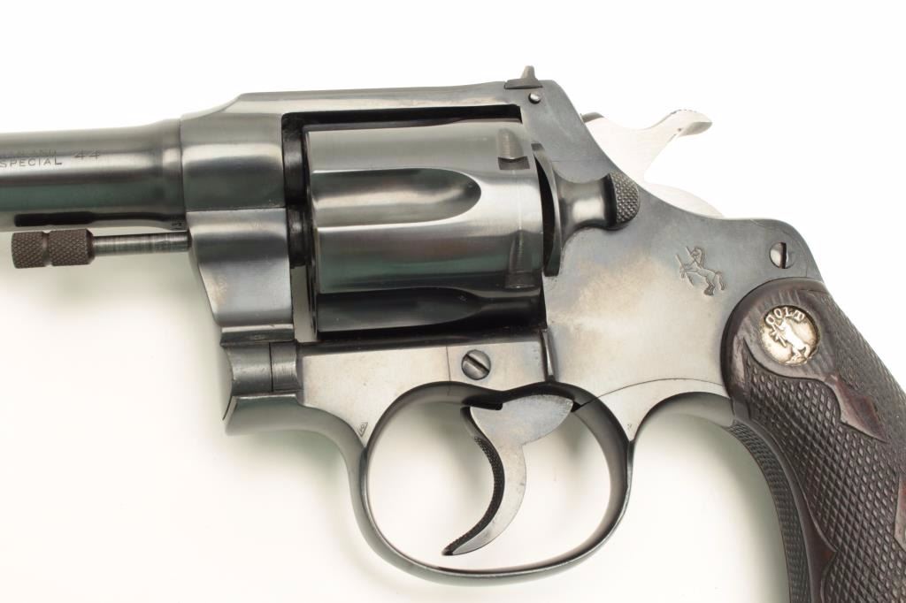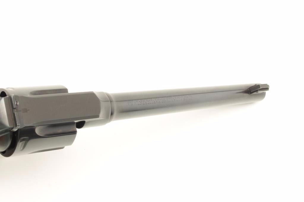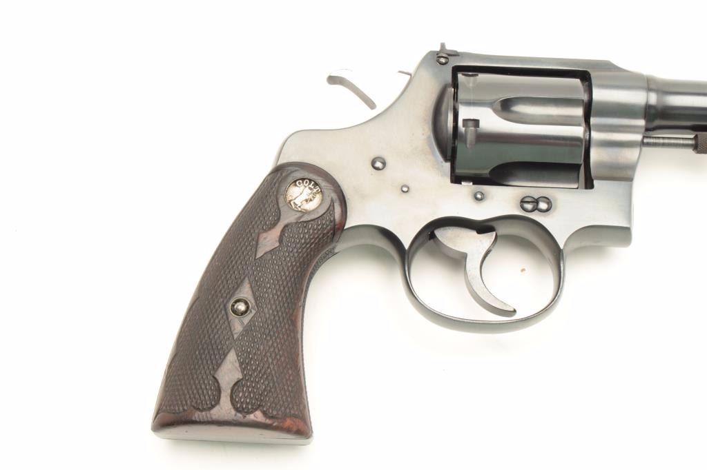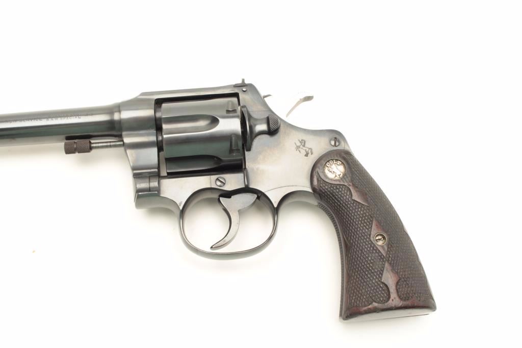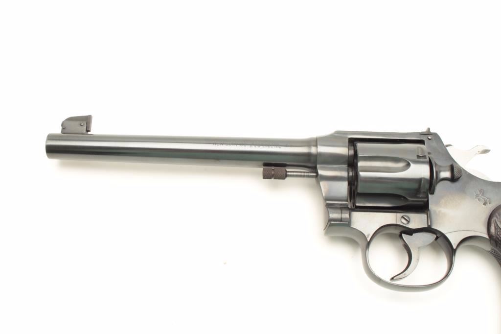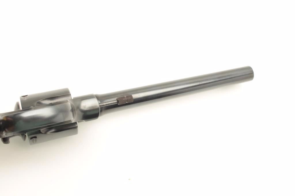 Colt New Service Target revolver, .44 S&W Special caliber, Serial #307318. The pistol is in minty overall condition as factory re-finished and rebuilt with a 7 ½” barrel. The pistol retains nearly all of a factoryre-finish with only light handling marks noted. The checkered wood silver medallion grips are in very good condition with small mars and compressions consistent with carry and use. The consignor notes indicate thepistol was assembled on July 16, 1920 in .45 Colt caliber. It was shipped on October 19, 1920 to an unspecified dealer. The pistol returned to the factory sometime after 1926 where it was rebuilt in .44 Special. Thebore is very good, the markings are sharp and action crisp on this fine New Service from the collection of Gil Newton. Est.: $1,400-$2,800. (C+R).