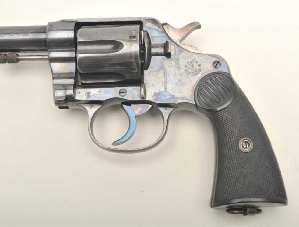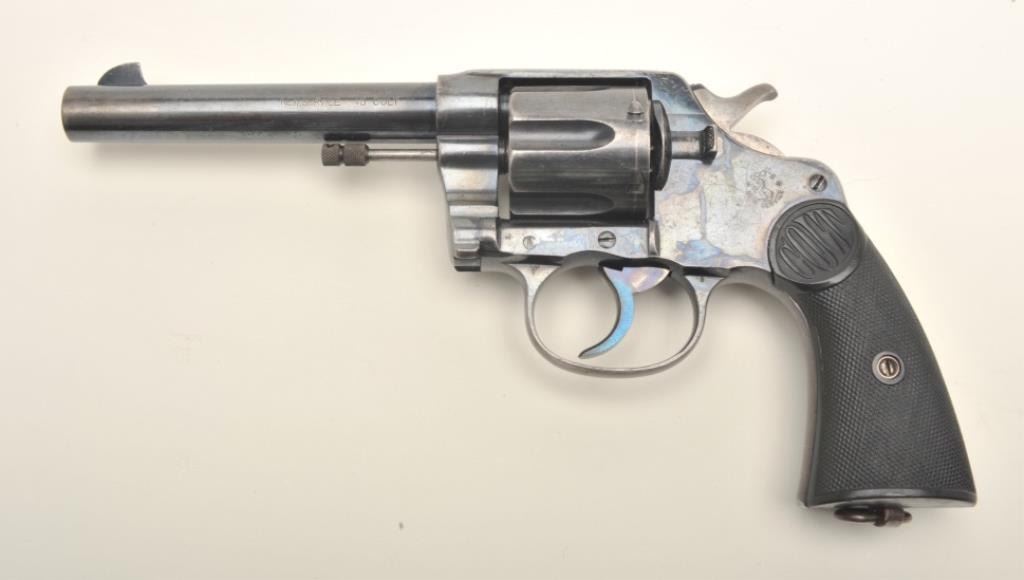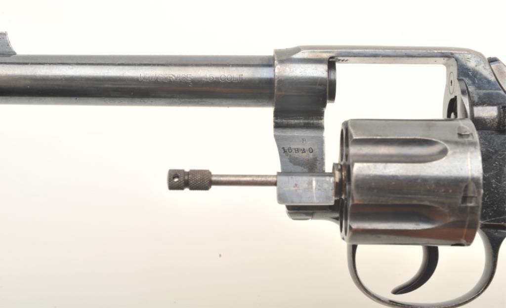 Colt New Service DA revolver, .45 Colt caliber, 5.5ā barrel, blued finish, checkered black hard rubber grips, S/N 16820, in overall very good + condition showing the majority of its original finish to metal surfaces, some holster wear on the barrel, crisp action, sharp markings, very good bore and grips; also a āCā around broad arrow proof on the left lower part of the frame (Canada?). (C& R/PPT). Est.: $1,400-$2,800.