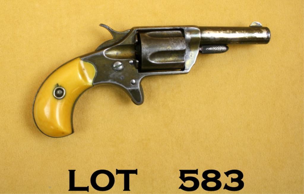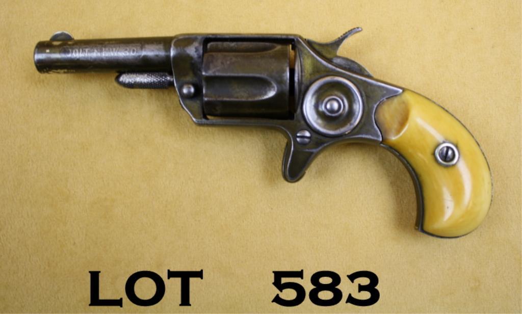 Colt Newline revolver, .30 caliber, traces of darkened silver plate, original ivory grips, serial #1563. The revolver shows a dark patina with some erosion and pitting on front of cylinder and considerable original finish under blackened tarnish. About 70% of the etched panel is visible. There is some marring to the edges of the cylinder pin. The condition is good and uncleaned overall with lovely original ivory grips showing a deep yellow patina. Est: $500 - $1,000