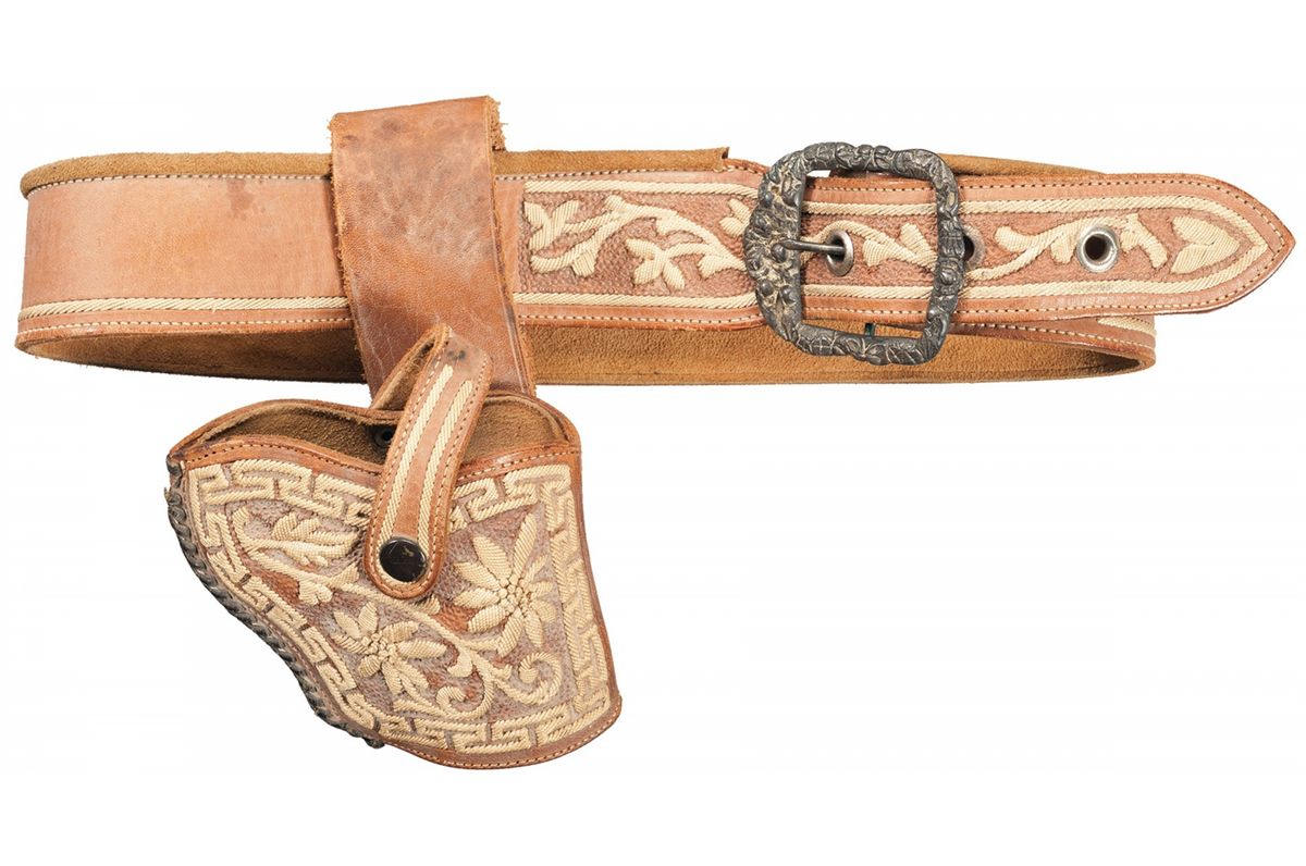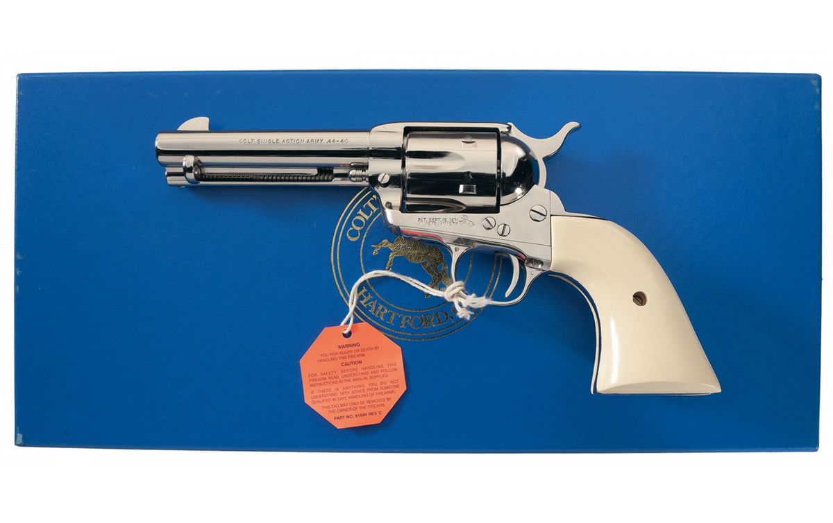 Manufactured in 1995 with standard markings and features with plastic steerhead grips. Serial number on bottom of frame is matched to grip straps underneath left grip. Grips are two-piece plastic with a carved "steer's head" on the right grip. Complete with factory Colt Custom Shop blue box with white sleeve numbered to gun, belt, holster and papers.