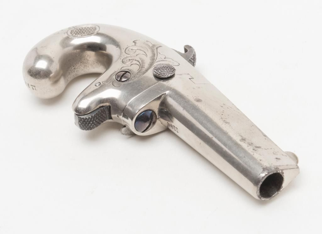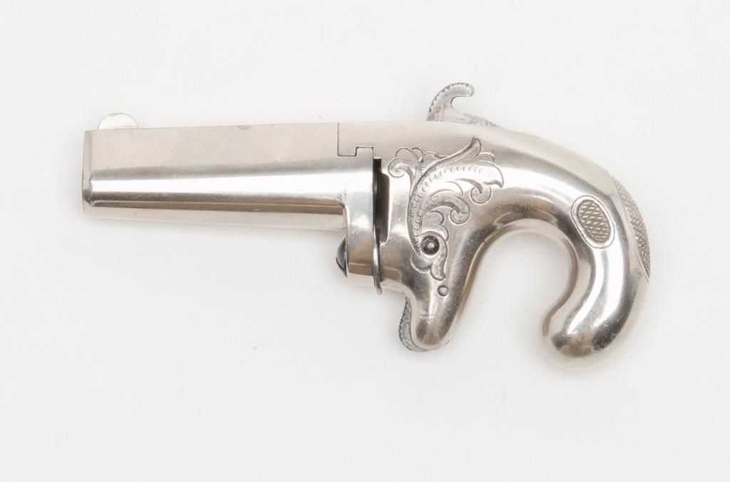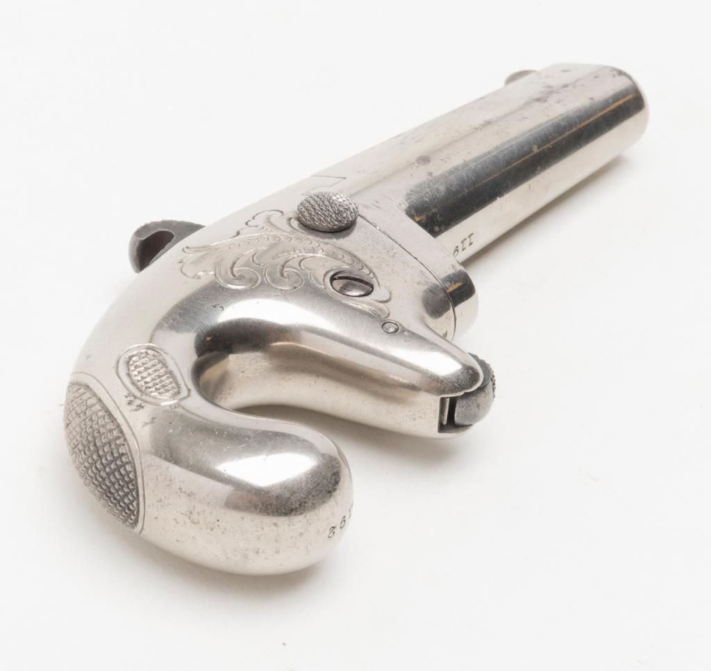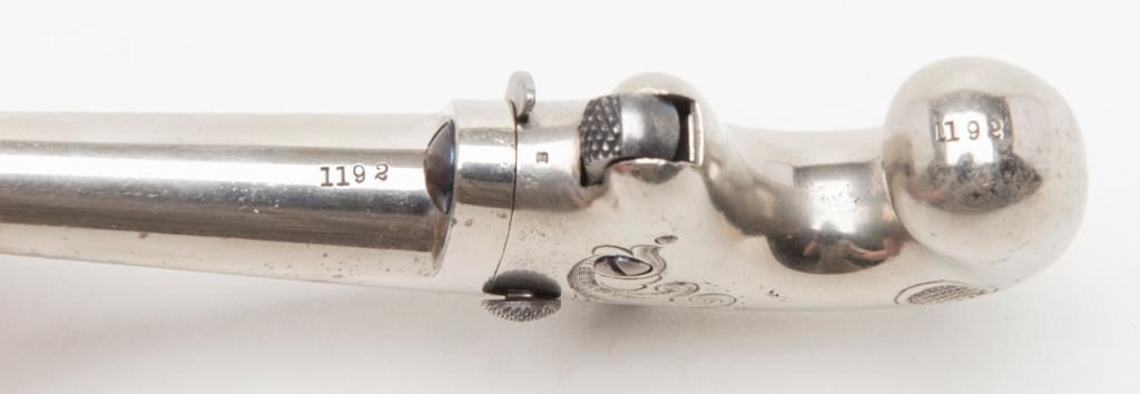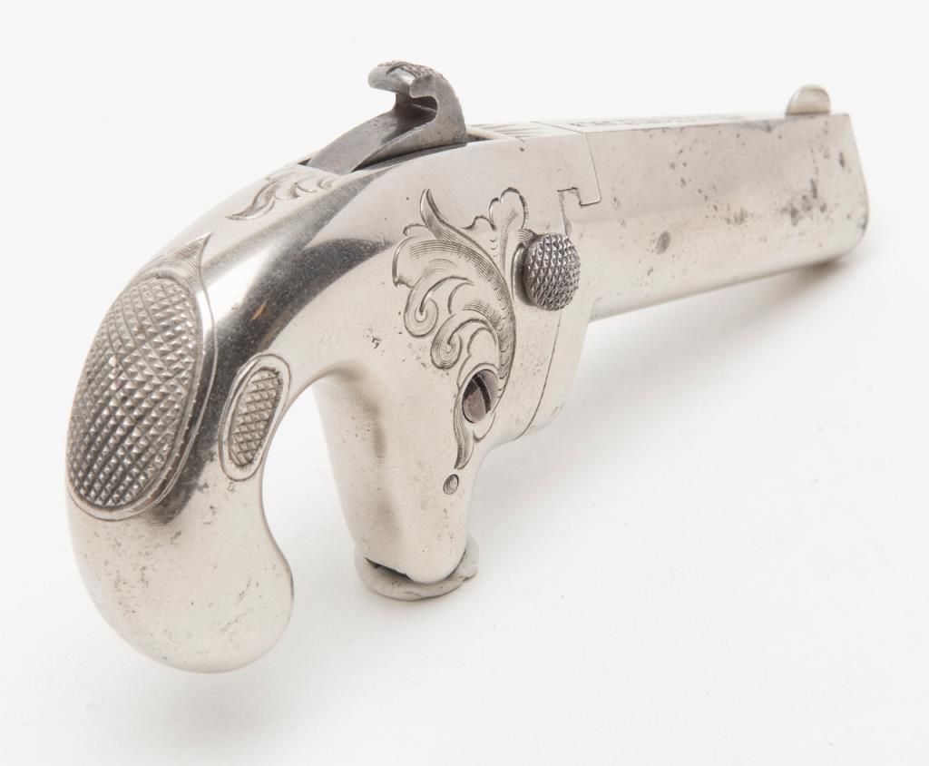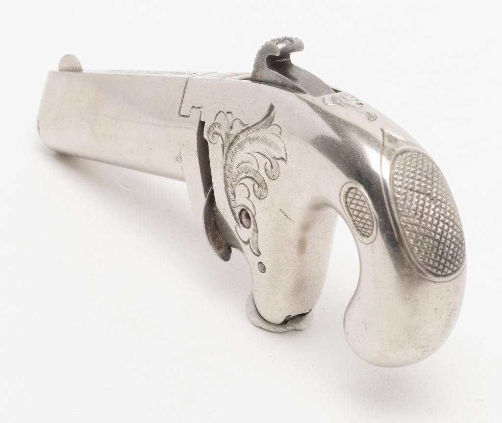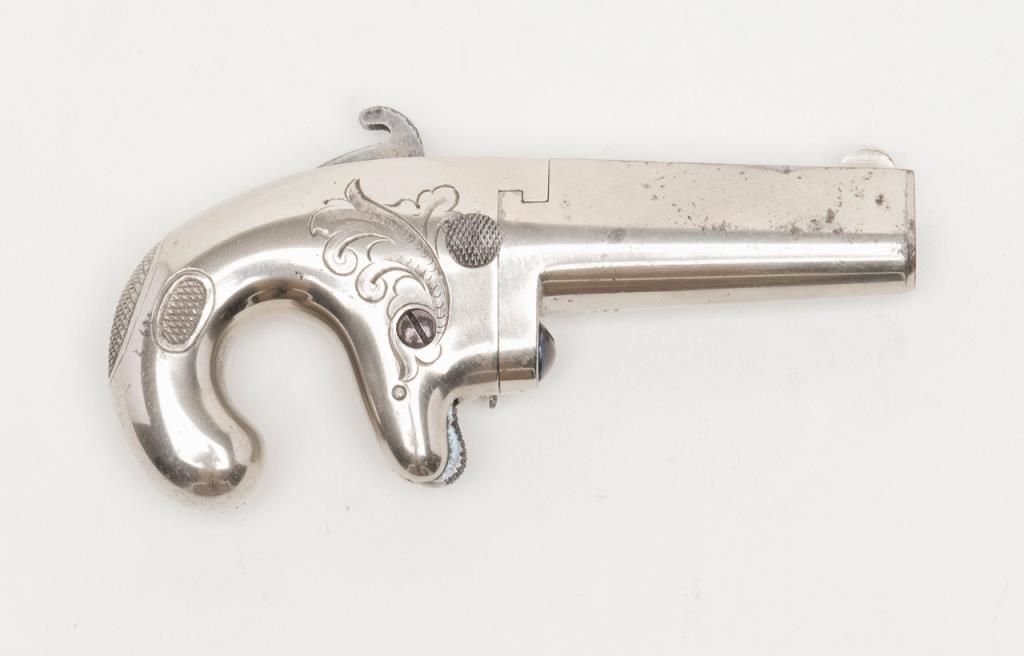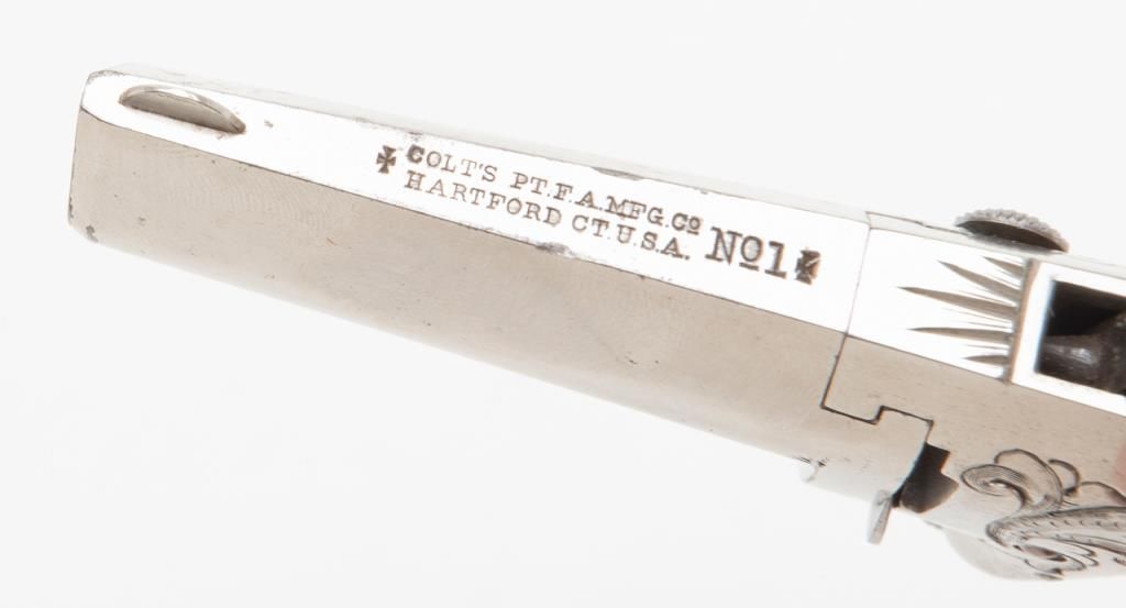 Colt No. 1, .41 caliber Derringer in fine to excellent original condition retaining most of its original nickel finish, serial number 1192. Approximately 90% -95% plus bright original nickel finish remains with only some very slight lossesat the muzzle and edges with a miniscule amount of nickel aging. The engraving and knurling are sharp and crisp. The screw, trigger and small parts show most of their original bright blue as does the hammer which retains its original spur.There is just a small amount of pinprick erosion and beginning normal age with a slight nick on one edge of the barrel. The barrel address is sharp and crisp. No British proofs. A strong 9 ½ on a scale of 1 to 10. The original release latch isretained and the bore is bright. It would be extremely difficult and expensive to improve on this Colt No. 1 as they are almost impossible to in this condition. Consigned to us by a San Diego collector’s estate who never saw a better examplein a lifetime of collecting. Which is why he purchased it from us two years ago at auction. Est.: $4,000-$8,000