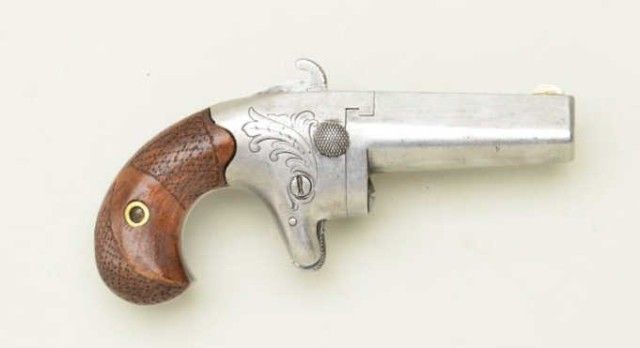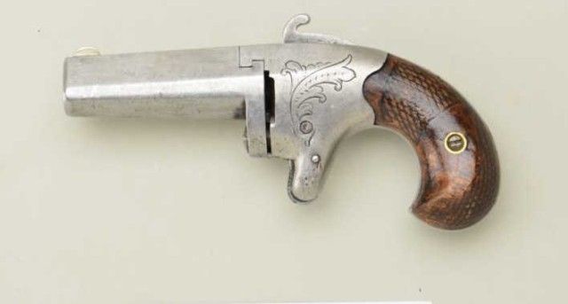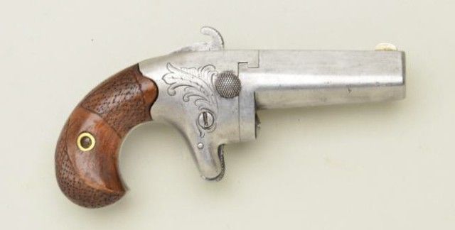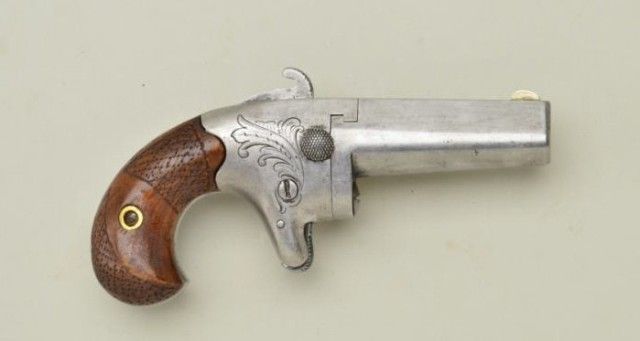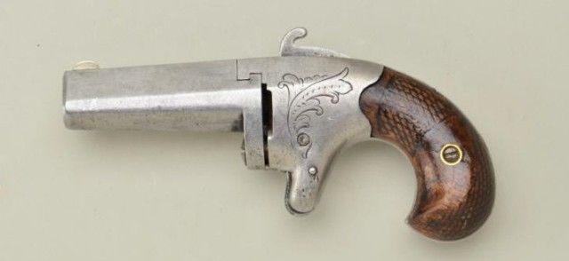 Colt No. 2 41 caliber derringer, serial #370 in good original condition showing a lightly cleaned to gray patina finish with sharp barrel markings. The grips are good with some edge wear and retracing to checkering on right side, minor nics, mars and normal aging. The hammer shows considerable case hardening, the button release is original, the sheet metal extractor is missing, the bore is very good. A representativespecimen. Est.;$700.-$1,400.