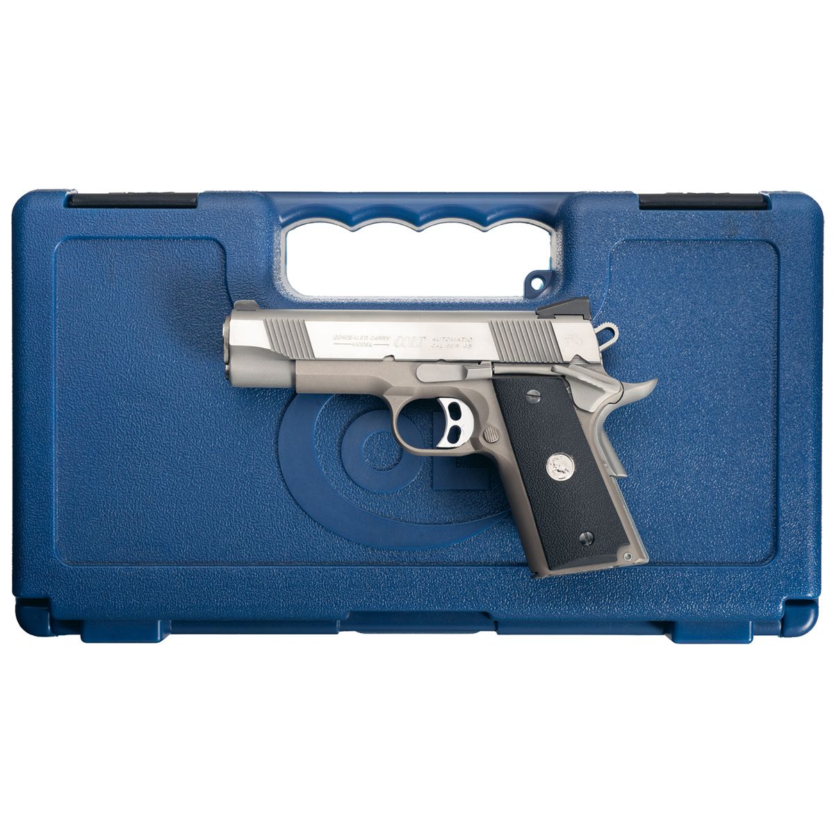 Standard markings, three dot dovetail rear sights, skeletonized trigger and hammer, seven round magazine, and textured two piece grips with silver Colt medallions. Complete blue Colt case.