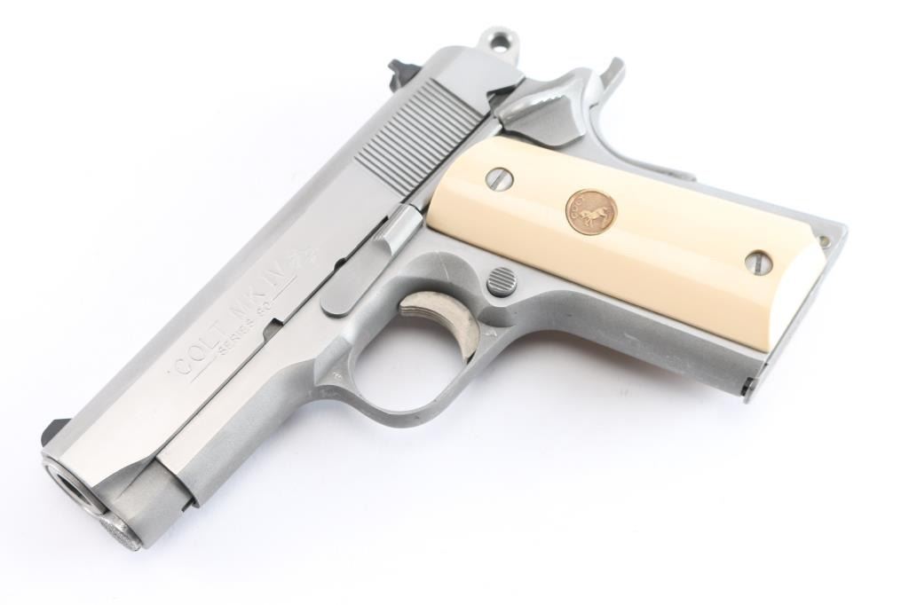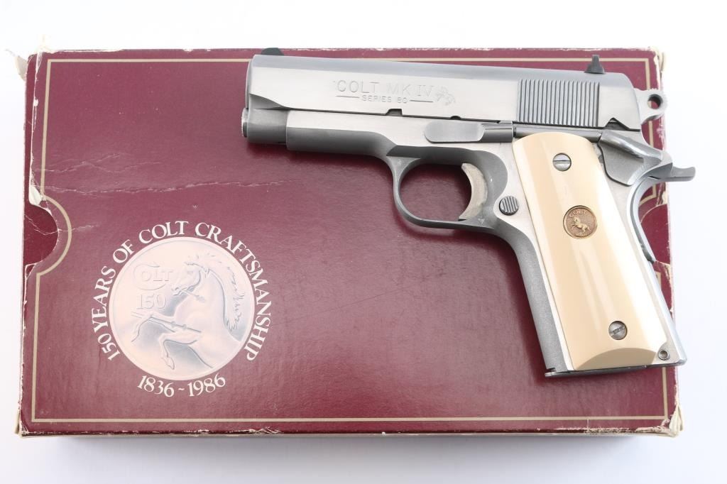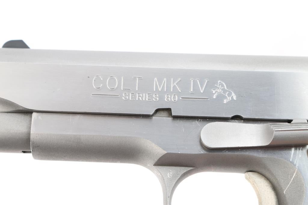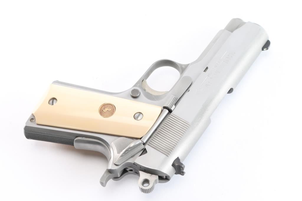 American made 'MK IV Series 80' semi-automatic single action pistol chambered in .45 Automatic Colt Pistol, manufactured circa 1986 in Hartford, CT. This stainless steel 1911 features polished flats and matte contours, a 3-1/2" heavy barrel, white dot front sight, dovetailed square notched rear sight with white dots, round skeletonized hammer, serrated hammer spur, serrated flat mainspring housing, smooth front strap, smooth grip safety, dual recoil springs, short single-piece metal guide rod, serrated frame mounted manual safety, fixed serrated and slotted recoil spring plug, seven round magazine capacity, serrated push-button magazine release, and two-piece smooth faux ivory grips with gold colt medallions. The original stainless finish retained is approximately 95% with scattered minor scratches. Metal displays no rust or deformation. Bore appears bright with strong rifling, and the action is smooth and crisp. Grips are very good with some light blemishes, and a very small chip and crack on the corner of the right grip panel. Pistol includes original factory cardboard box, paperwork, and one Colt marked magazine total.