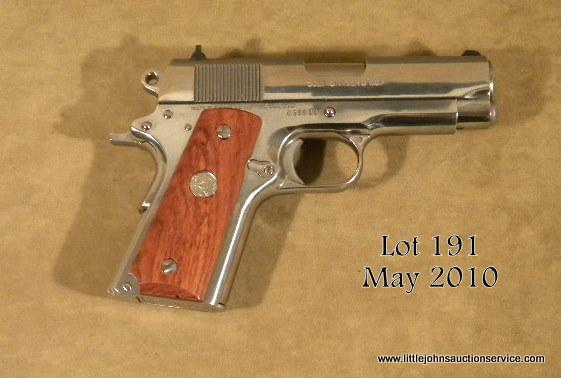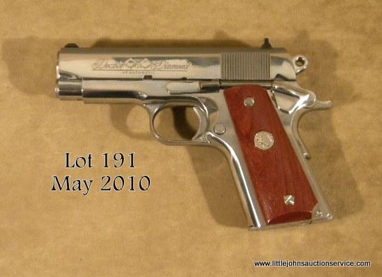 Colt Officer’s “Double Diamond” Model compact semi-auto pistol, .45 cal., polished steel with top of slide mat finished, medallion wood grips, #0985DD. This gun is in overall fine condition showing little handling, fine bore, crisp action,sharp markings and grips; fixed three white dot sights; accompanied by its original factory box, numbered to this gun and original factory instructions and paperwork. Est.: $600-$1,200.