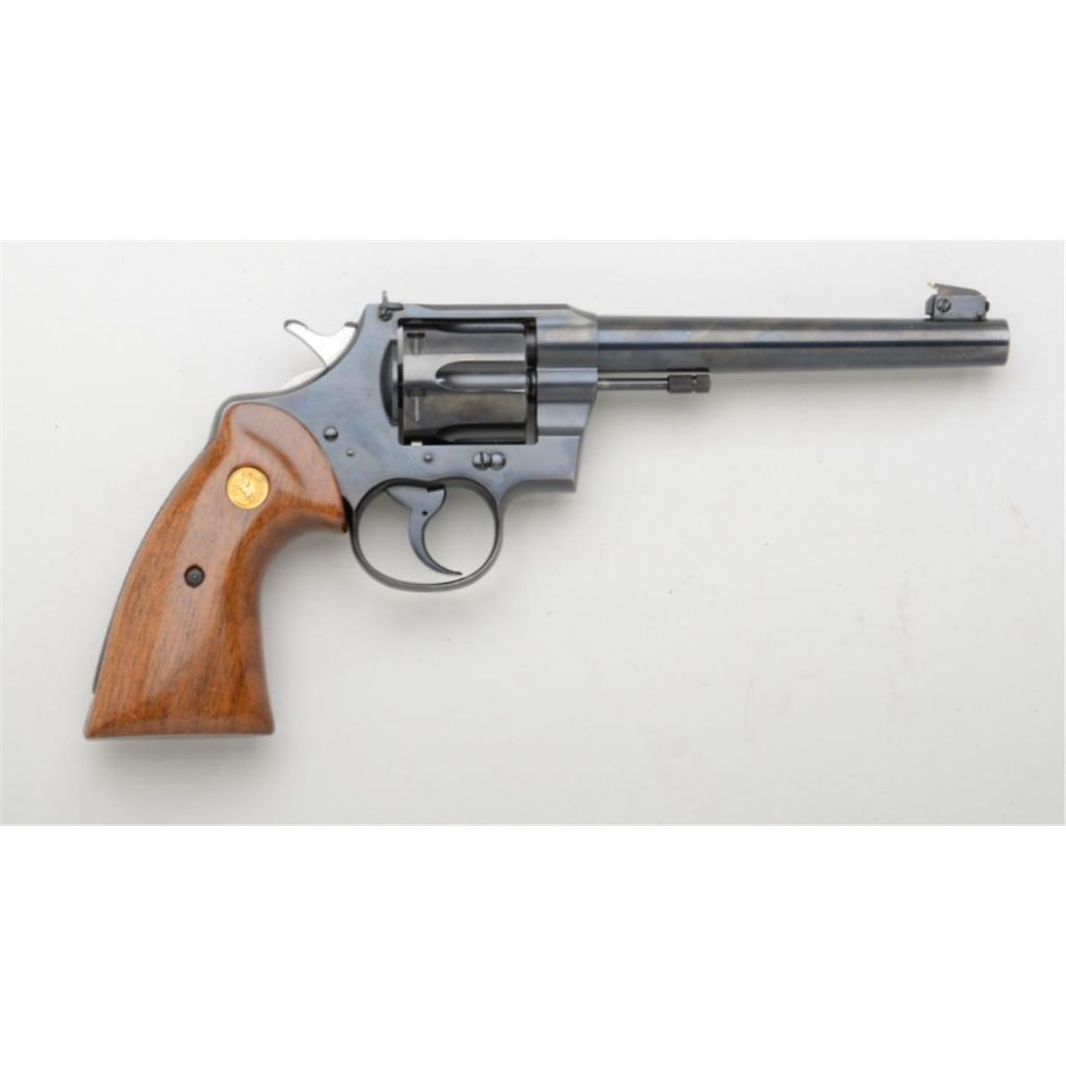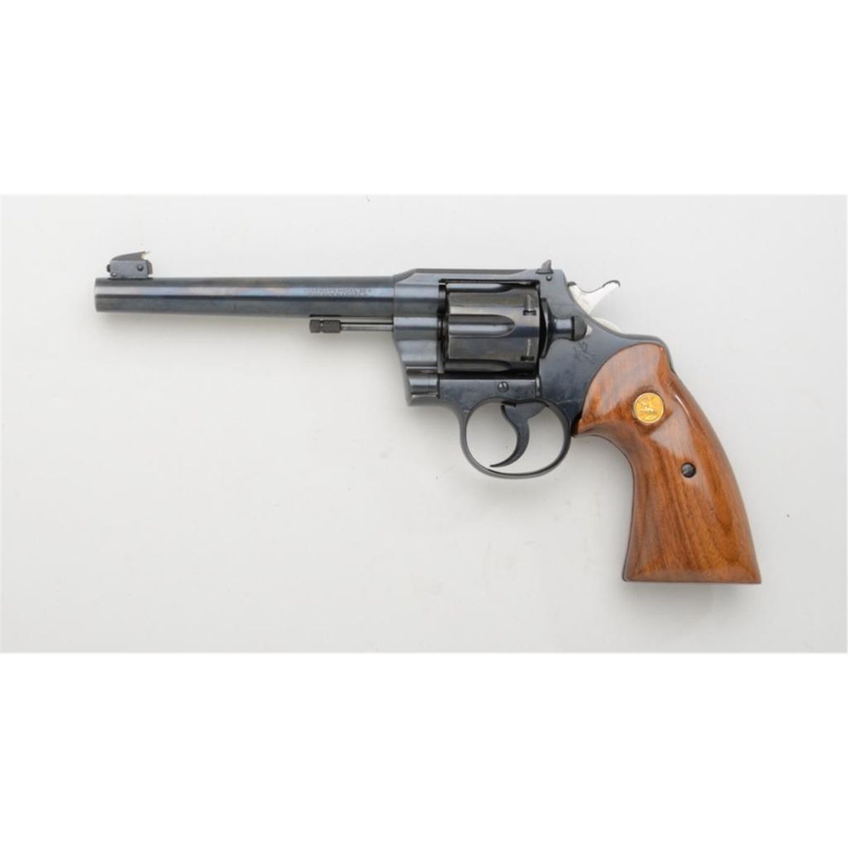 Colt Officer’s Model Heavy Barrel DA revolver, .38 cal., 6” barrel, blue finish, smooth wood medallion grips target sights, #616681. This gun is in overall excellent condition showing the majority of itsoriginal finish with just slight muzzle wear, fine bore, action, markings and grips; last patent date 1926; checkered backstrap. Est.: $250-$500.