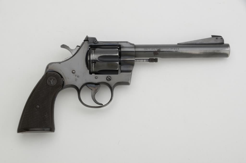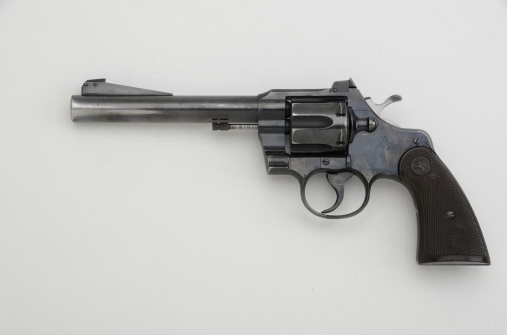 Colt Officer’s Model Special DA revolver, .22LR cal., 6” heavy barrel, blue finish, checkered hard rubber grips, adjustable rear sight, #61925. This gun is in overall very good + condition showing considerableoriginal blue finish, fine bore, crisp action, very good markings, very good grips but are loose and are of Colt manufacture but may not be for this specific gun; an unusual variation, this model appears to have beenmade in limited production in .38 Special and .22LR caliber during the late 1940’s-early 1950’s. Est.: $250-$350.