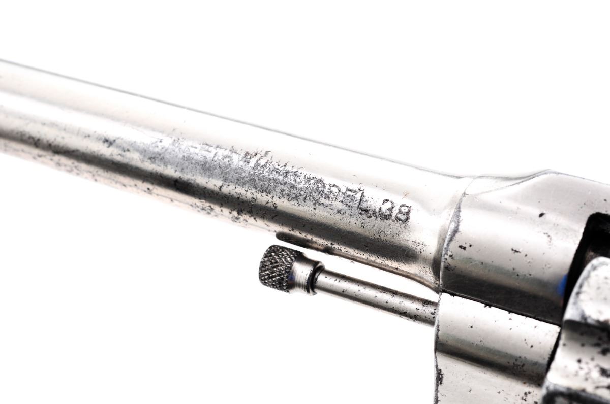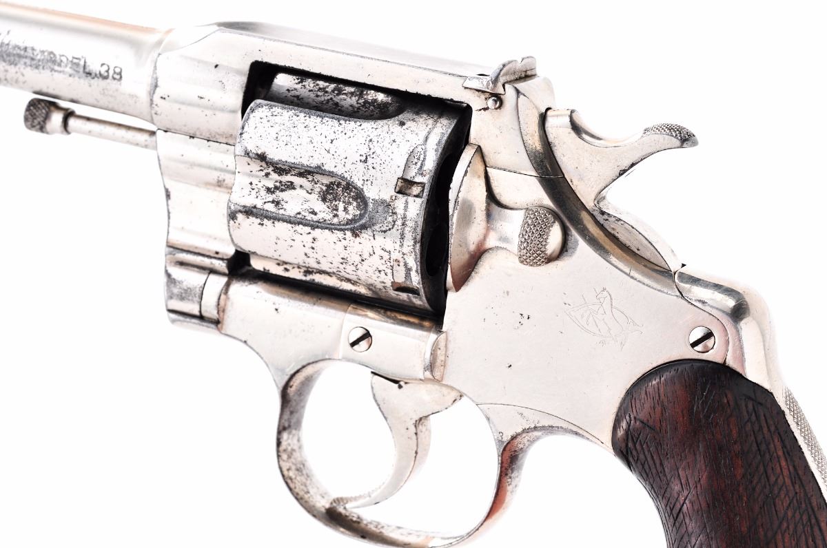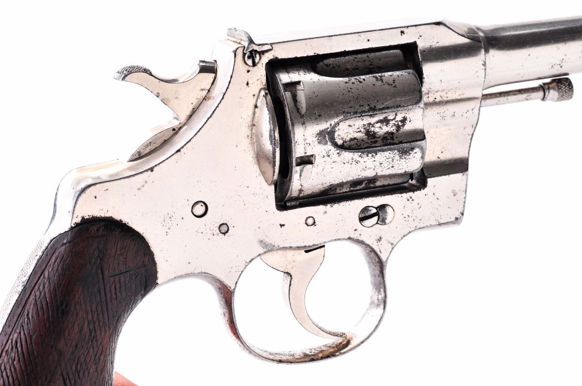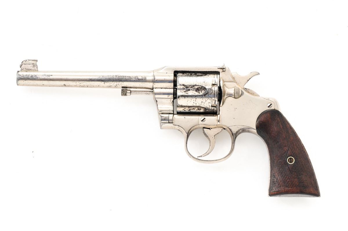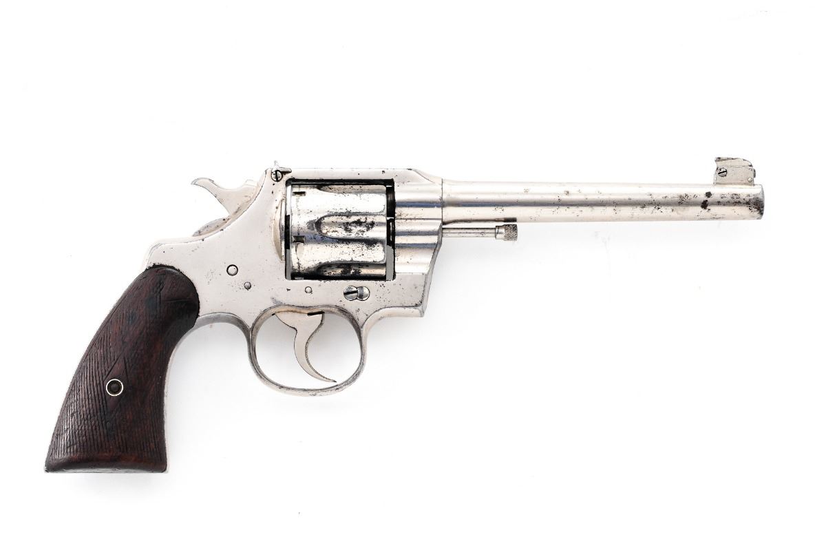 Colt Officer's Model Target 1st Issue Double Action Revolver, #314984, .38 Spec. cal., 6'' barrel, nickel finish, checkered walnut grips, elevation adjustable blade front sight and windage adjustable rear sight. Condition is good as re-nickled, retaining approx. 80% re-nickeled finish with most of the loss to the cylinder and barrel. Grips are fair with worn checkering. Action is tight with good lock up and timing, bore is rough. Est.: $250-$400. (C&R)