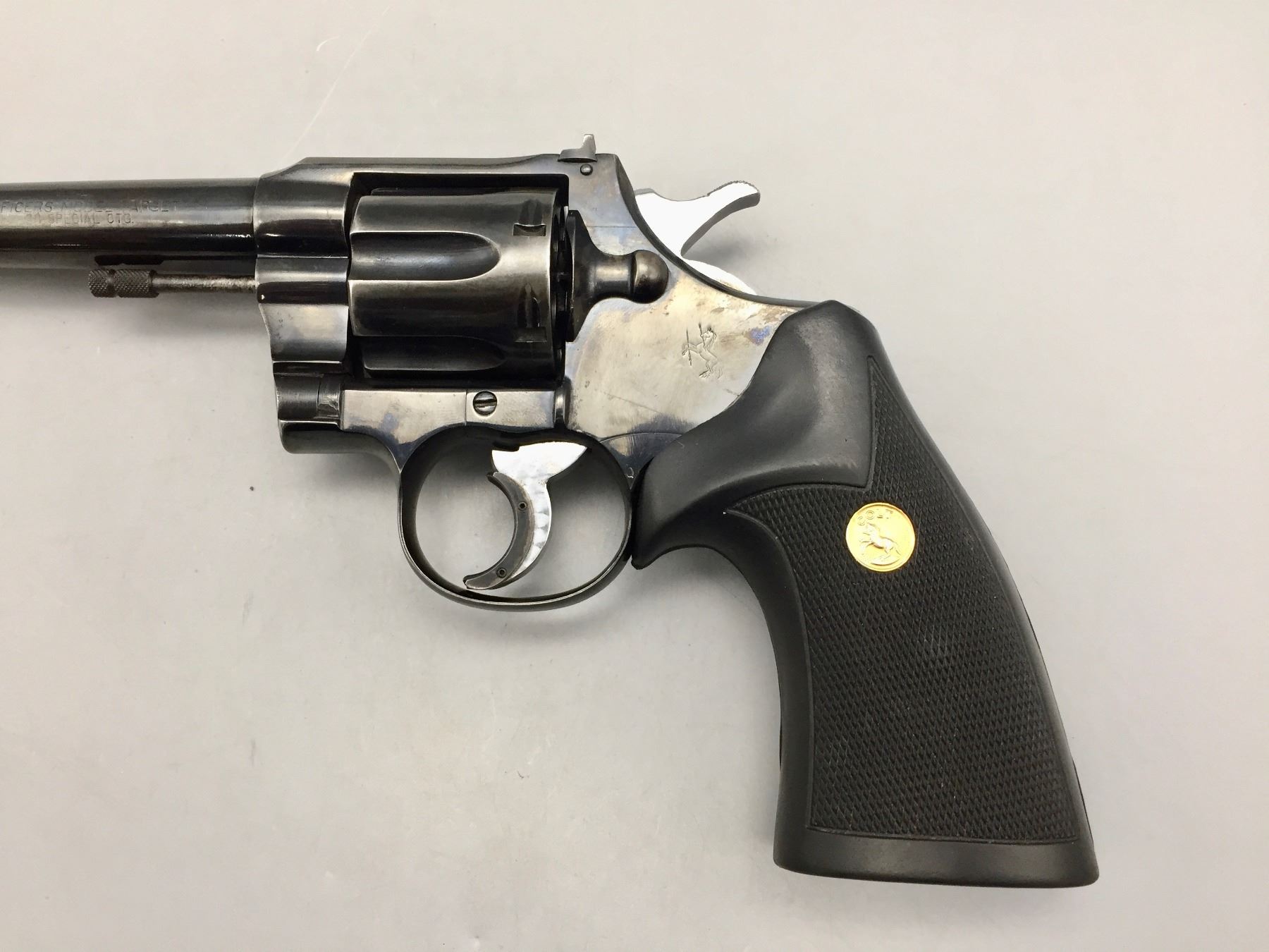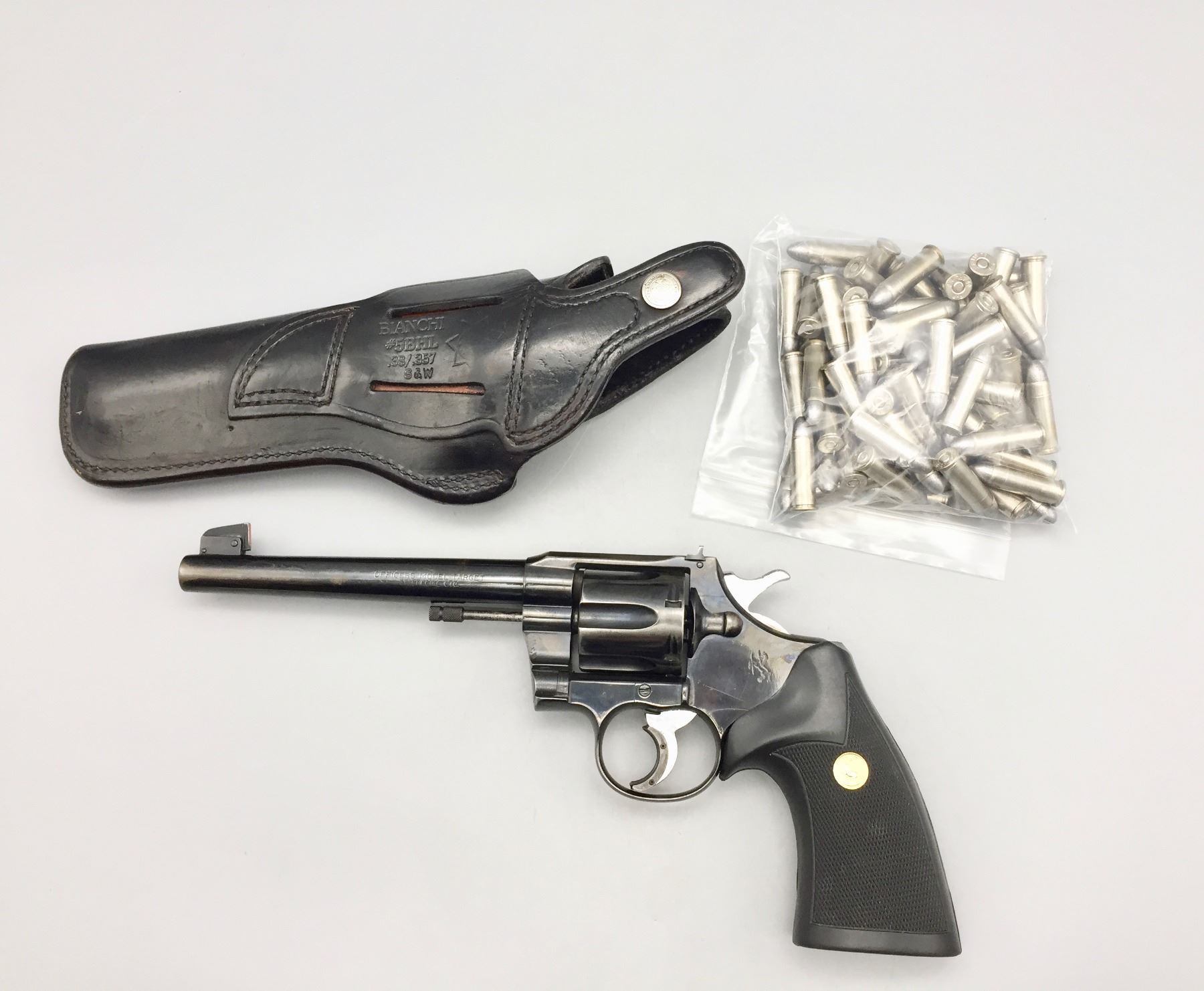 Description: Offered for sale in this lot is a Colt Officer’s Model Special (fourth issue, 1949-1952). It has original rubber grips with Colt emblem, a black leather, Bianchi holster and a small amount of ammo. Nice condition with most of its original finish. Maker: Colt’s PT. F.A. Mfg. Co., Hartford, Conn., Holster - Bianchi Gun Leather. Approx. Age: 1949. Size: 6” barrel. .38 special cal.. Condition: Good for its age, some wear expected. Retains most of its original finish. Please look closely at the pictures - they are an important part of our description. Shipping: There will be a $10 handling / packaging fee for shipping this lot. The actual cost of postage will be added on top of that. *****This firearm requires an FFL Transfer*****