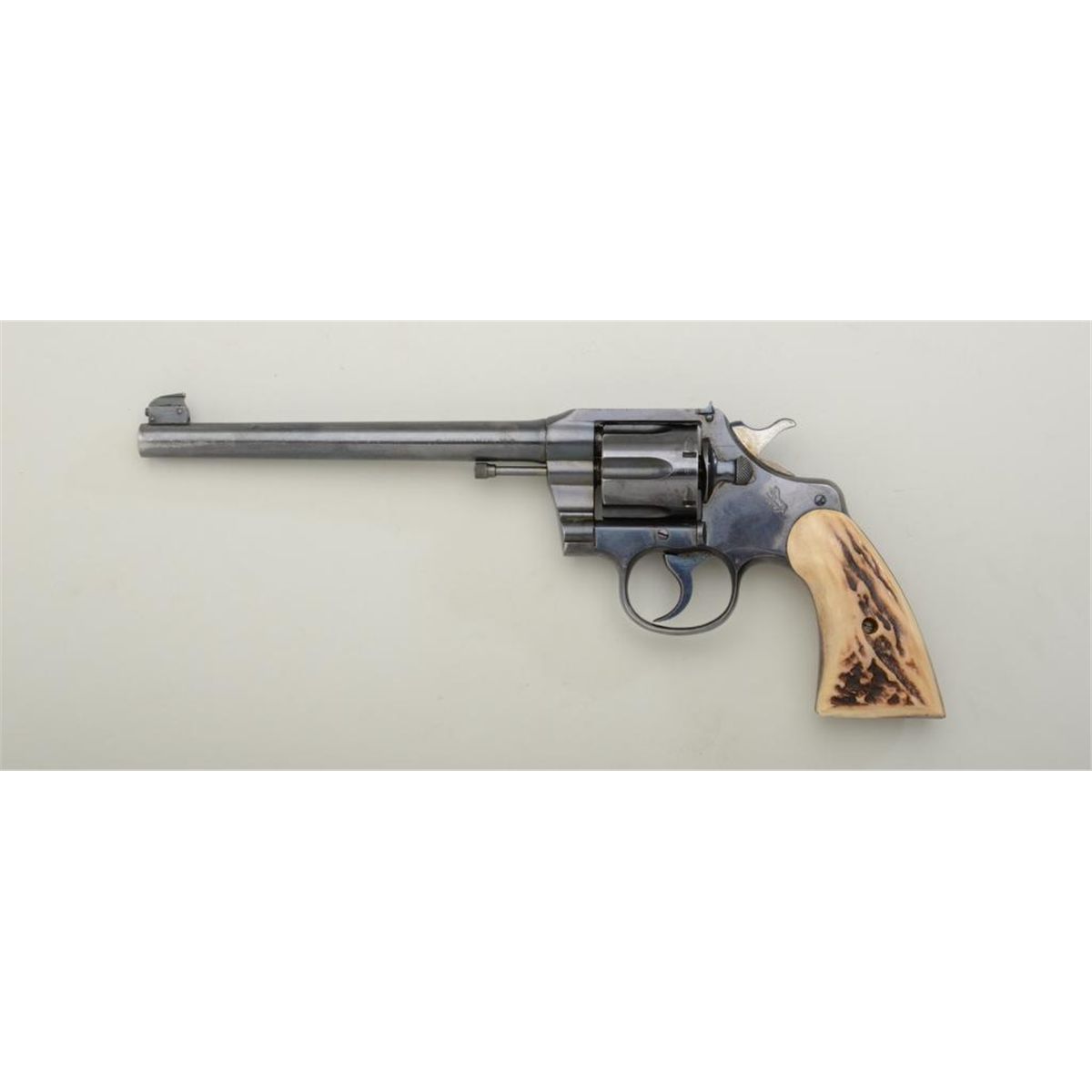 Colt Officer’s Model flat top Target revolver, .38 cal., 7-1/2” barrel, blue finish, custom stag grips, adjustable front and rear sights, checkered back strap, #358775. This gun is in overall excellentcondition showing approx. 95% original blue finish, fine bore, action and markings, very good custom stag grips. A finely made Colt from the early 1900’s. Est.: $400-$800.