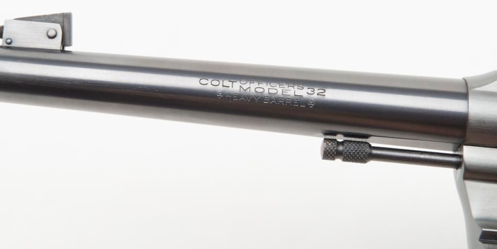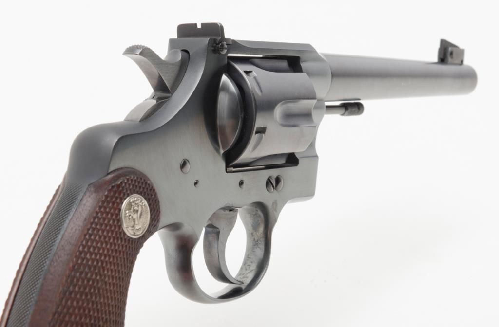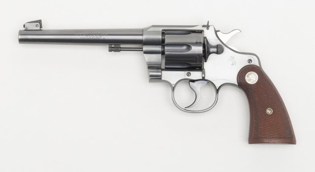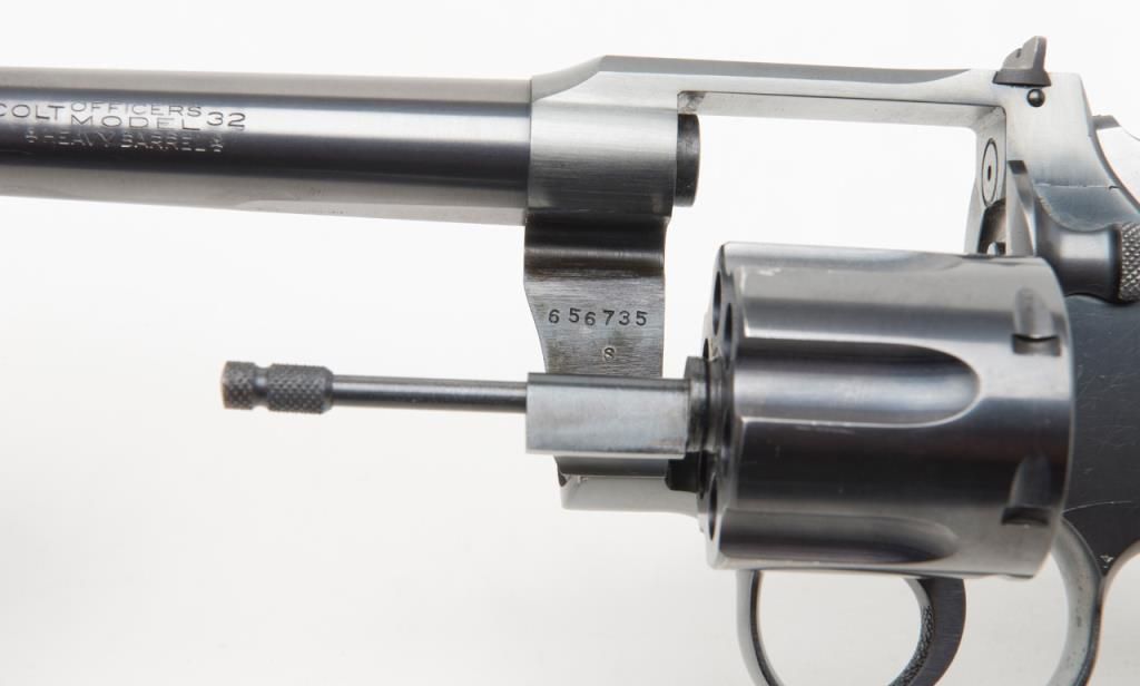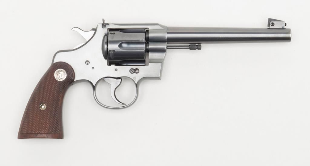 Colt Officers Model 32 Heavy Barrel revolver, cal. .32, Serial #656735. The pistol is in excellent condition showing approximately 98% of its blued finish with a 6” barrel and original box. The pistol was manufactured in 1941 and shows only some slight loss of finish at the muzzle and near a couple of the cylinder flutes. The checkered medallion grips are in excellent condition , showing minimal wear with outstanding fit and finish. The bore is excellent, the action crisp and markings sharp on this well cared for pistol. A great combination of condition and caliber. Included, original factory cardboard box, numbered to this gun on bottom in pencil with 2 end labels including a white label “TARGET HEAVY BARREL PARTIDGE SIGHT”; inside is a cleaning brush, Shooting Suggestions note and a Colt Regulation Police Target. (C+R). Est.: $1,250-$2,500.