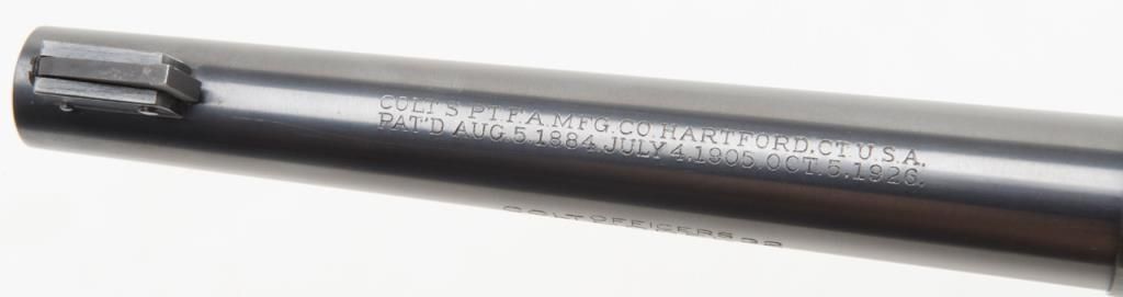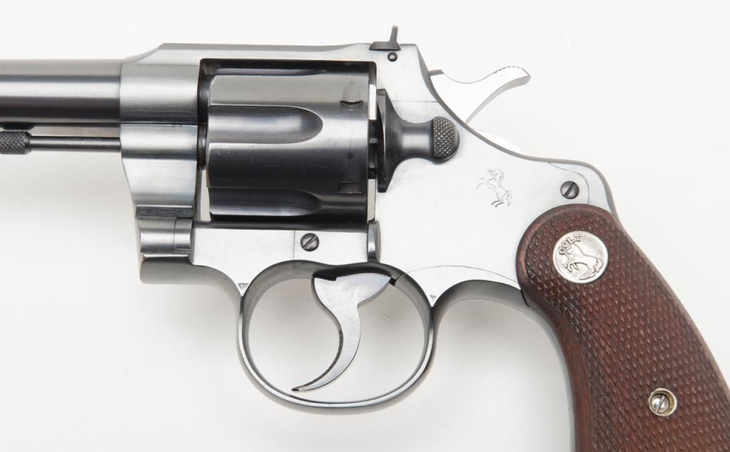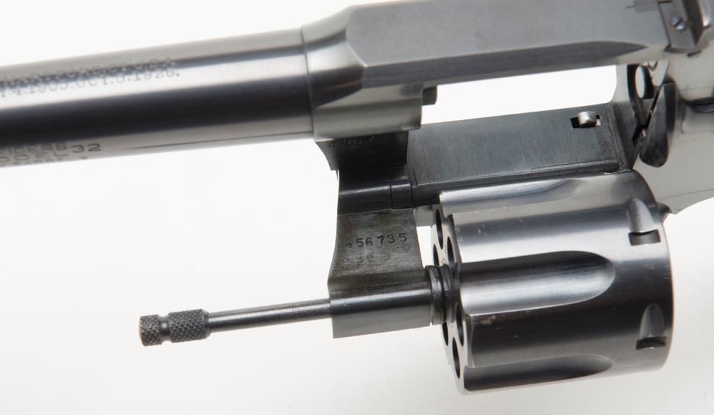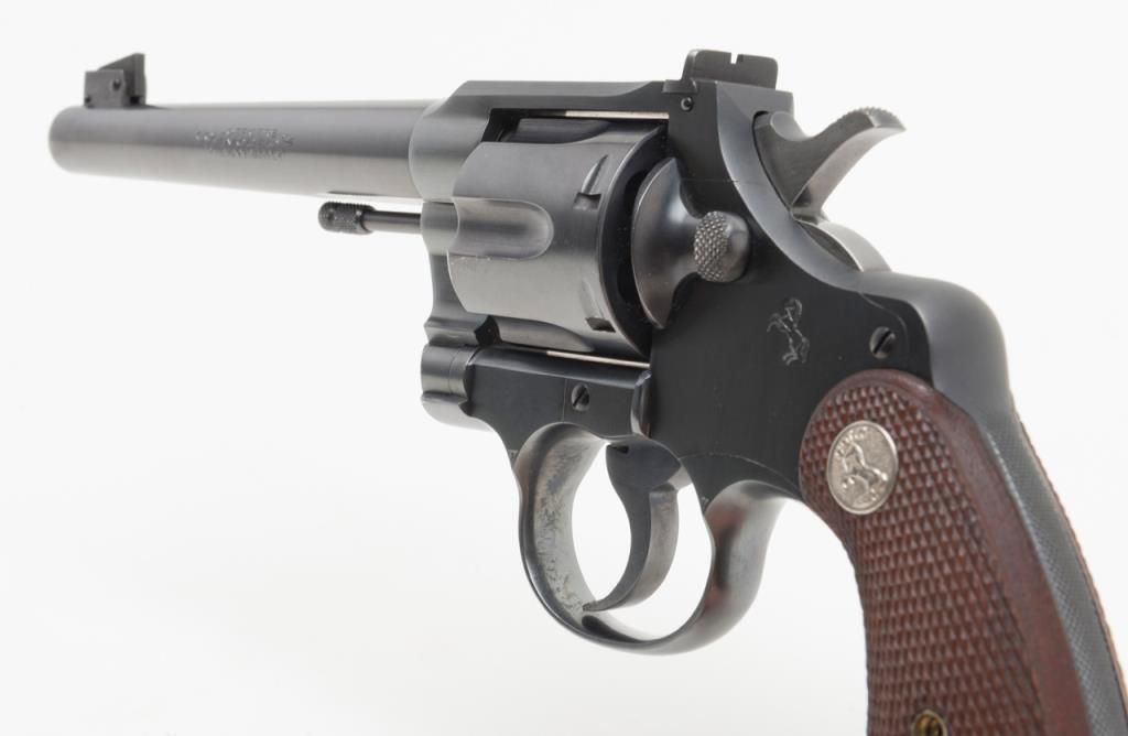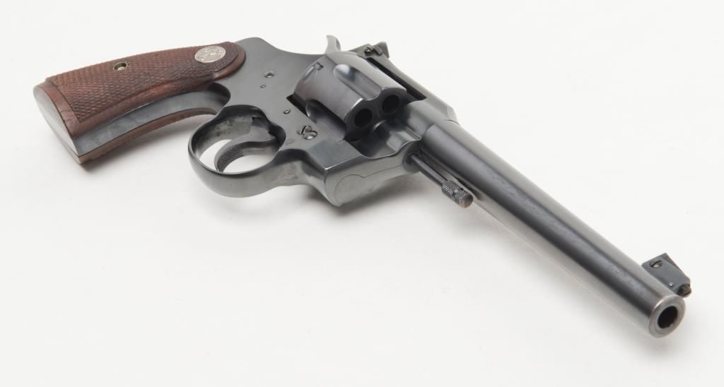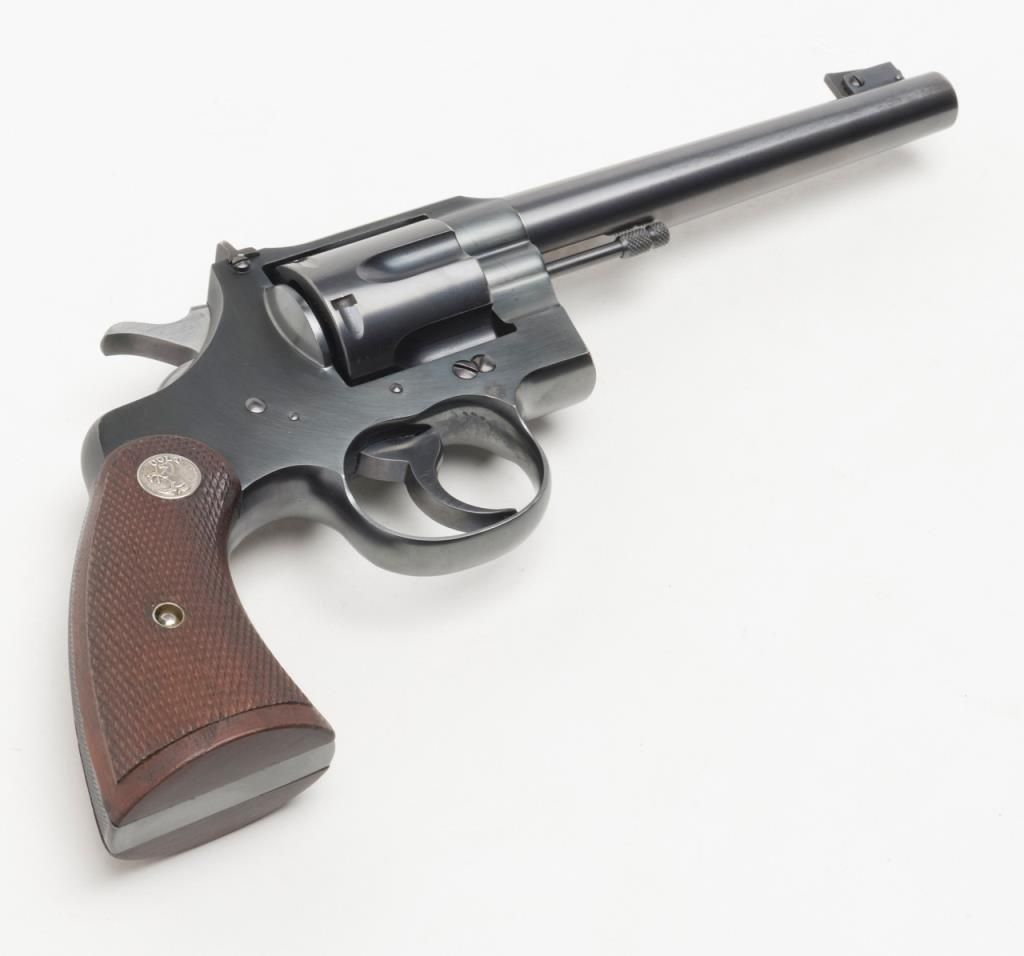 Colt Officers Model 32 Heavy Barrel revolver, cal. .32, Serial #656735. The pistol is in excellent condition showing approximately 98% of its blued finish with a 6” barrel and original box. The pistol was manufactured in 1941 and shows only some slight loss of finish at the muzzle and near a couple of the cylinder flutes. The checkered medallion grips are in excellent condition , showing minimal wear with outstanding fit and finish. The bore is excellent, the action crisp and markings sharp on this well cared for pistol. A great combination of condition and caliber. Included, original factory cardboard box, numbered to this gun on bottom in pencil with 2 end labels including a white label “TARGET HEAVY BARREL PARTIDGE SIGHT”; inside is a cleaning brush, Shooting Suggestions note and a Colt Regulation Police Target. (C+R). Est.: $1,250-$2,500.